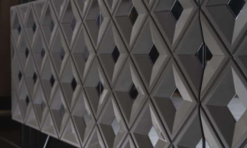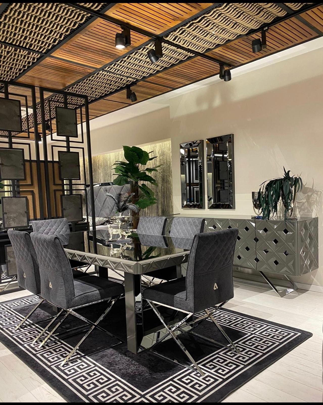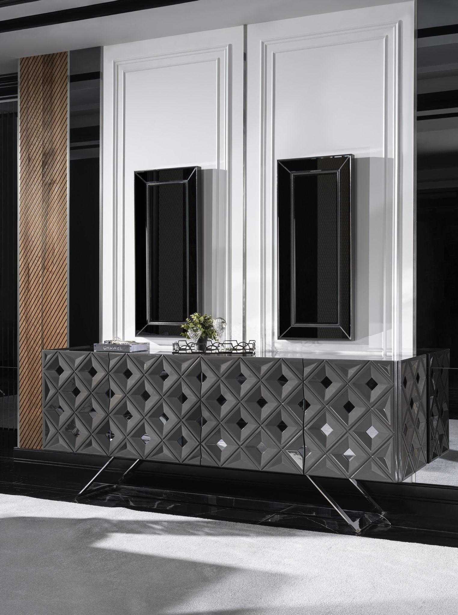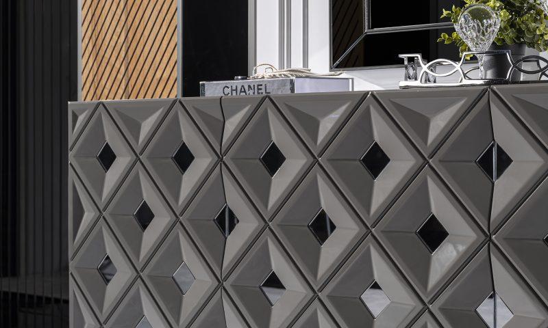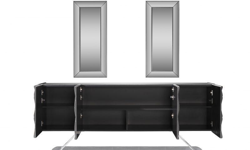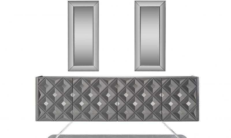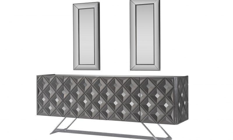 Asus komód / tálaló – magasfényű szürke & ezüst & tükör. A képen szereplő tükrök opcionálisan rendelhetőek.