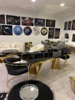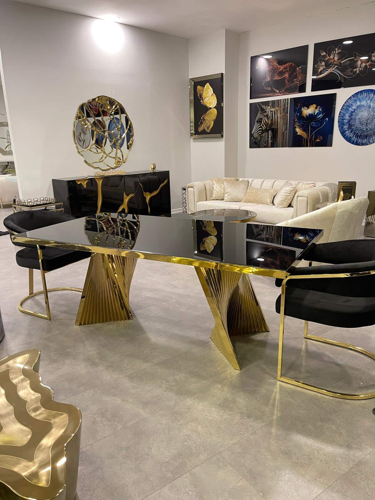 Candy gold étkezőasztal . Rozsdamentes acél láb aranyra fújva és temperált fekete üveglap.