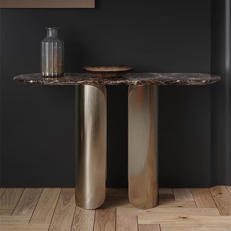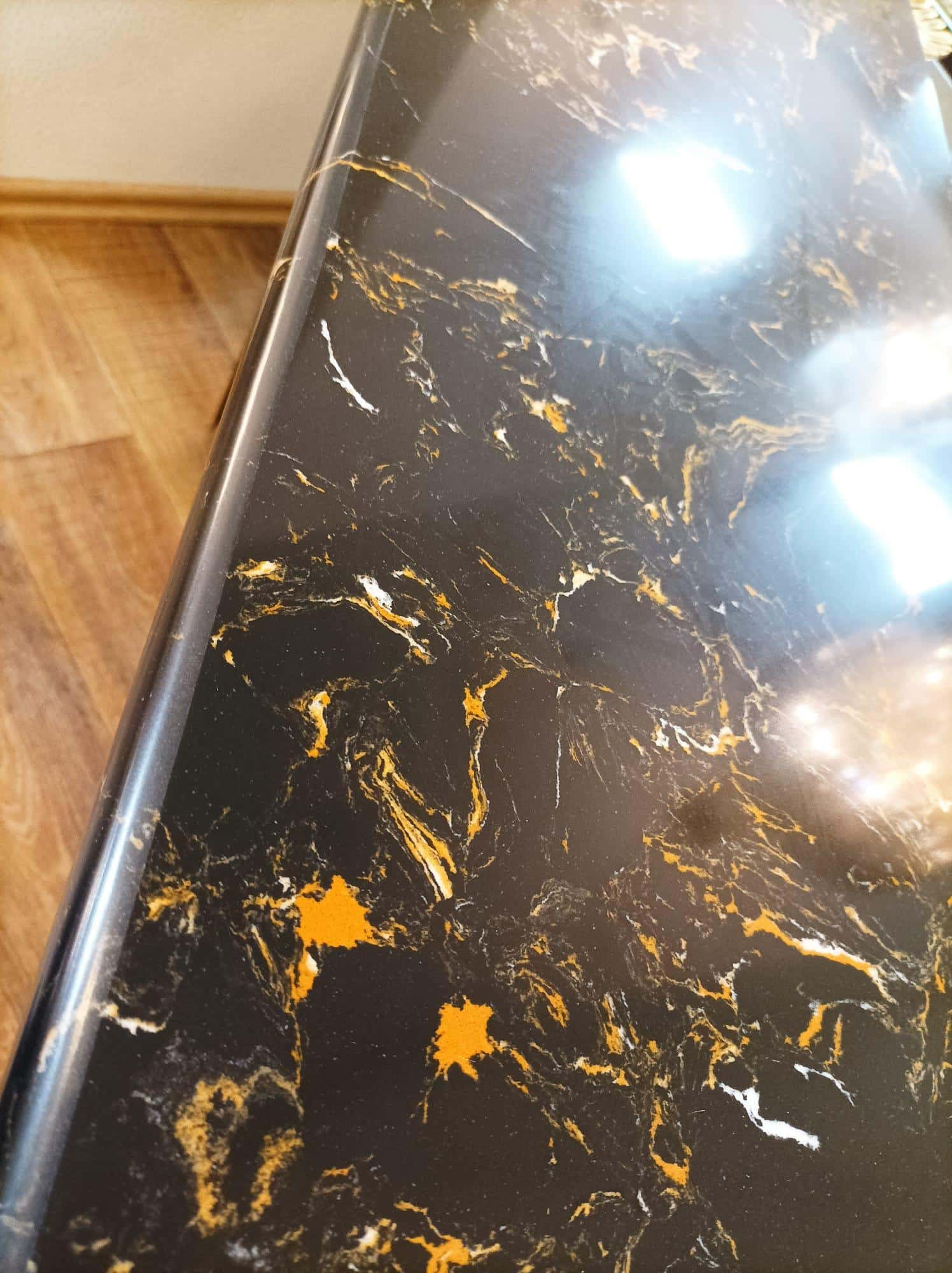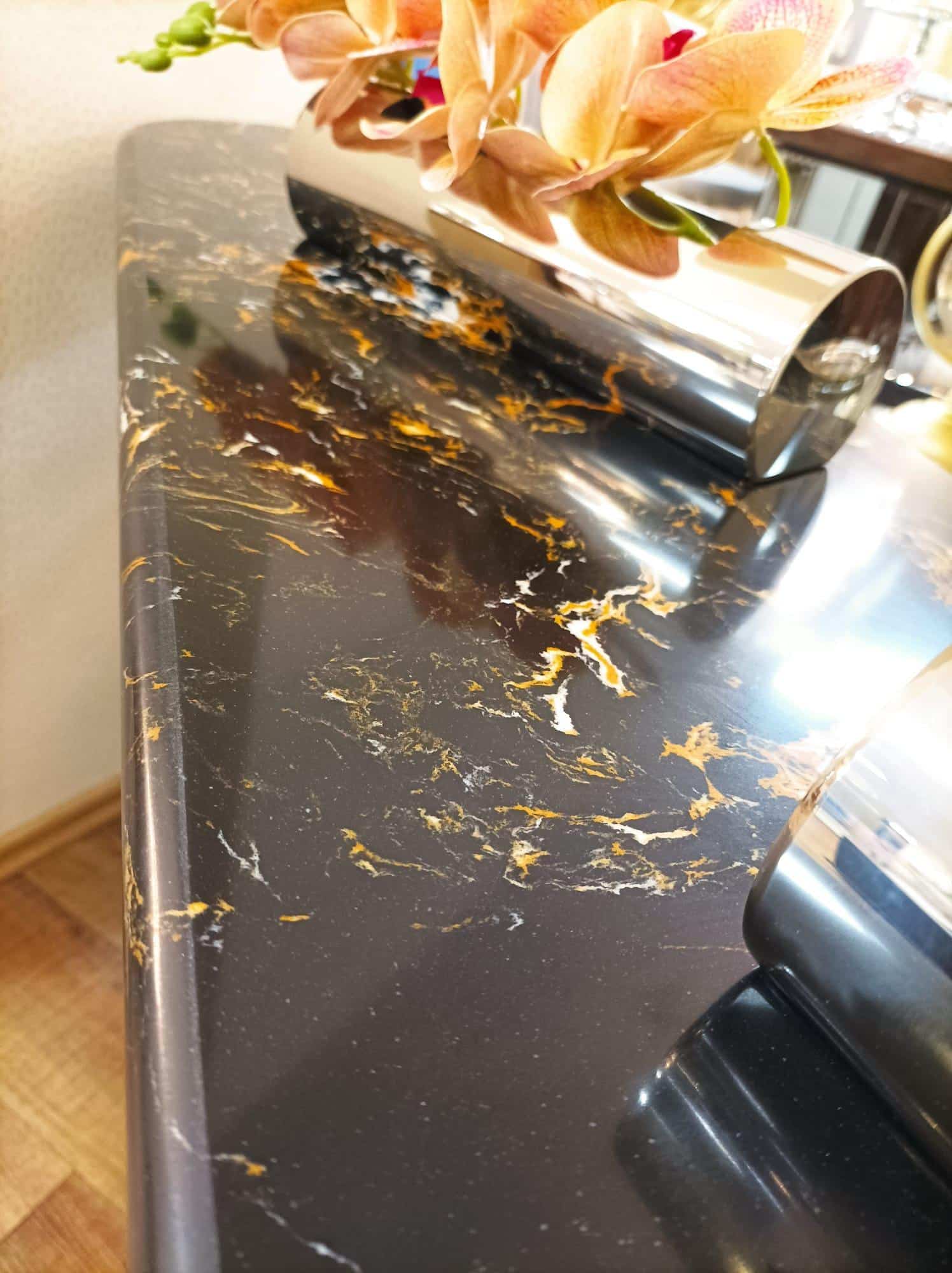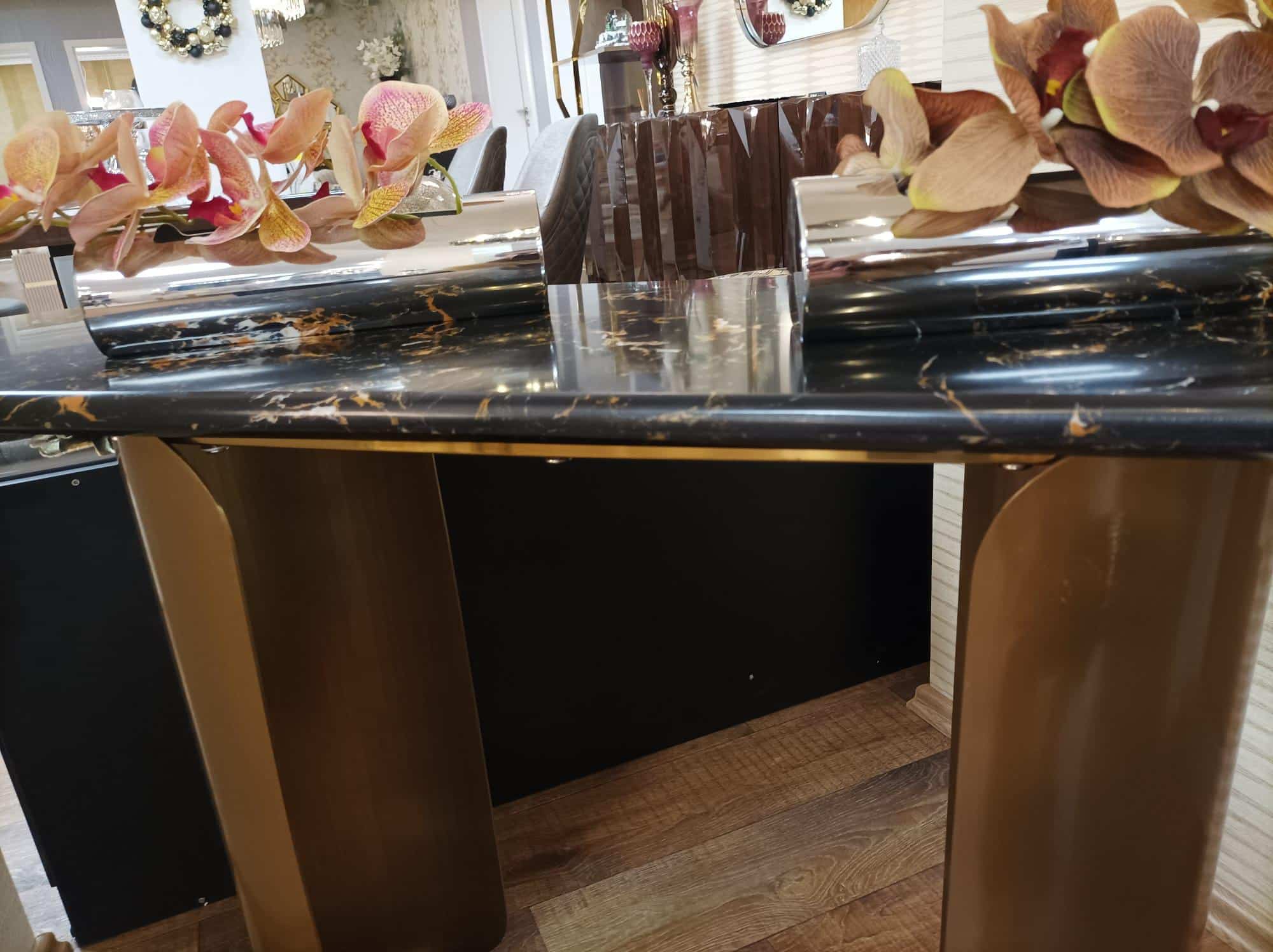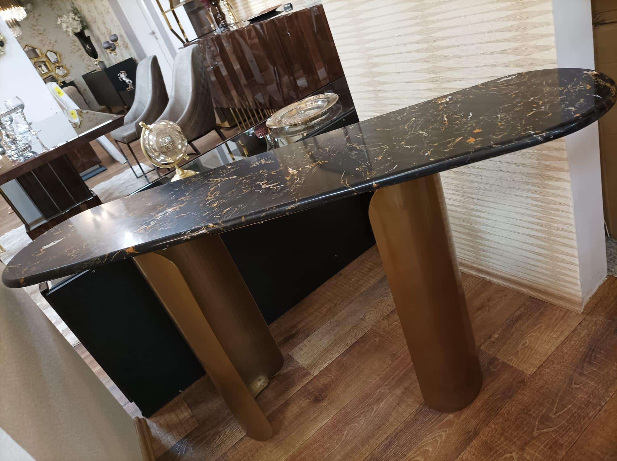 Dubai konzolasztal- fekete  arany mintás  márványlap & rozsdamentes arany talpazat.