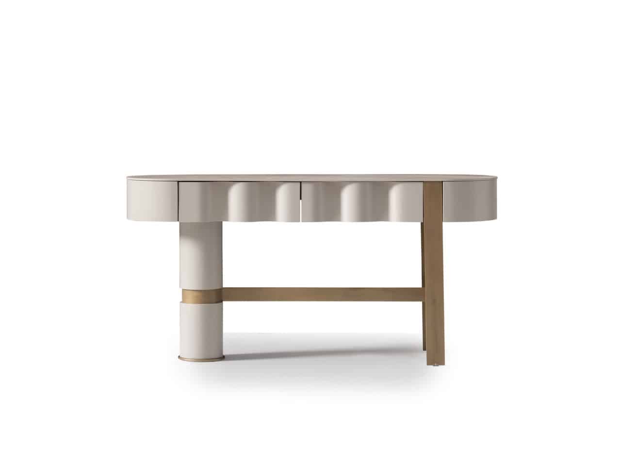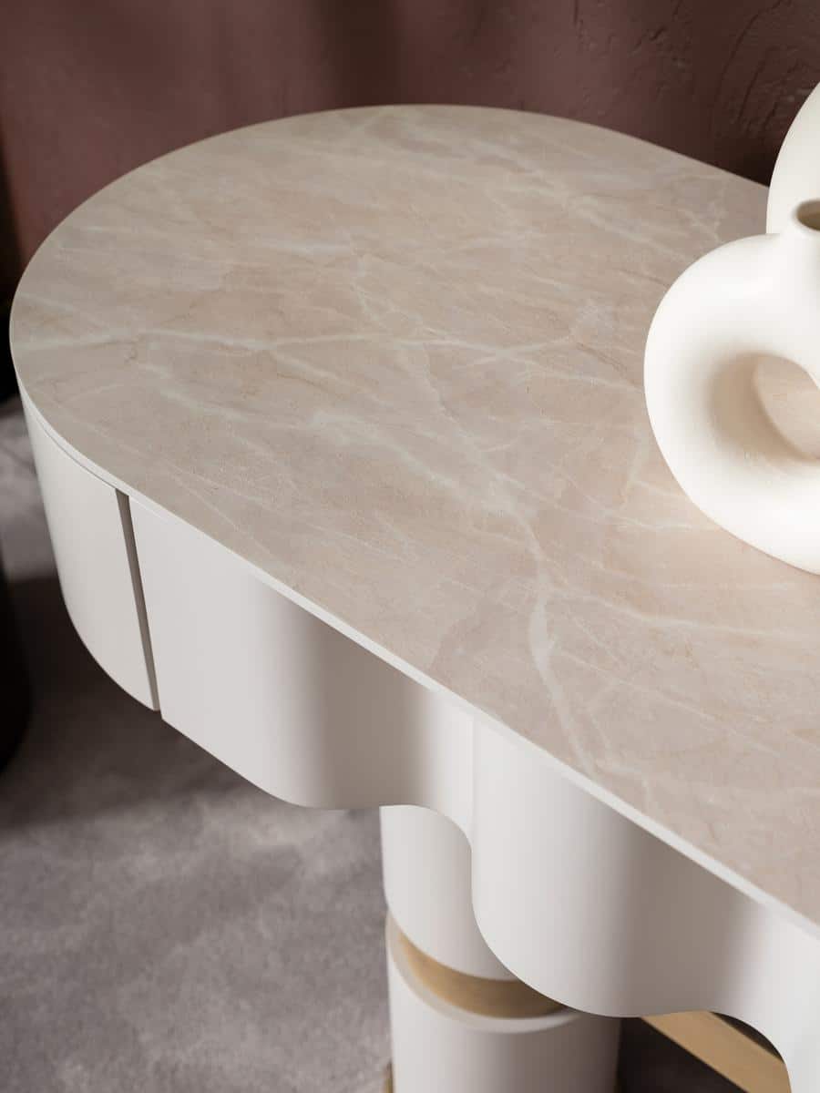 Porto konzolasztal bézs színben, szálcsiszolt arany berakással és mintázott matt fedlappal.
