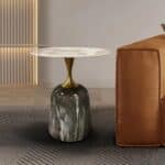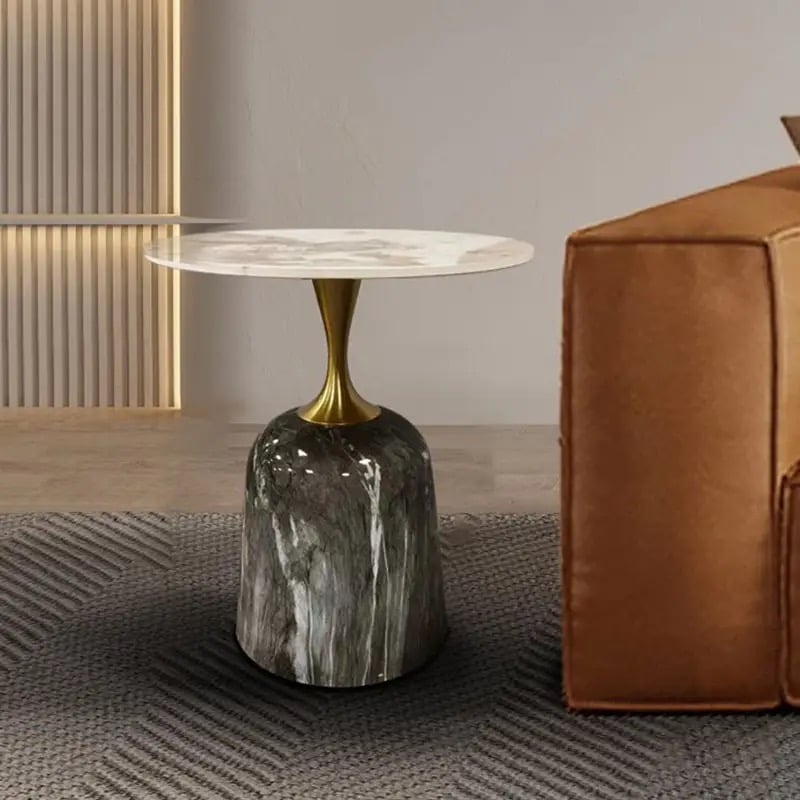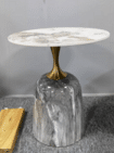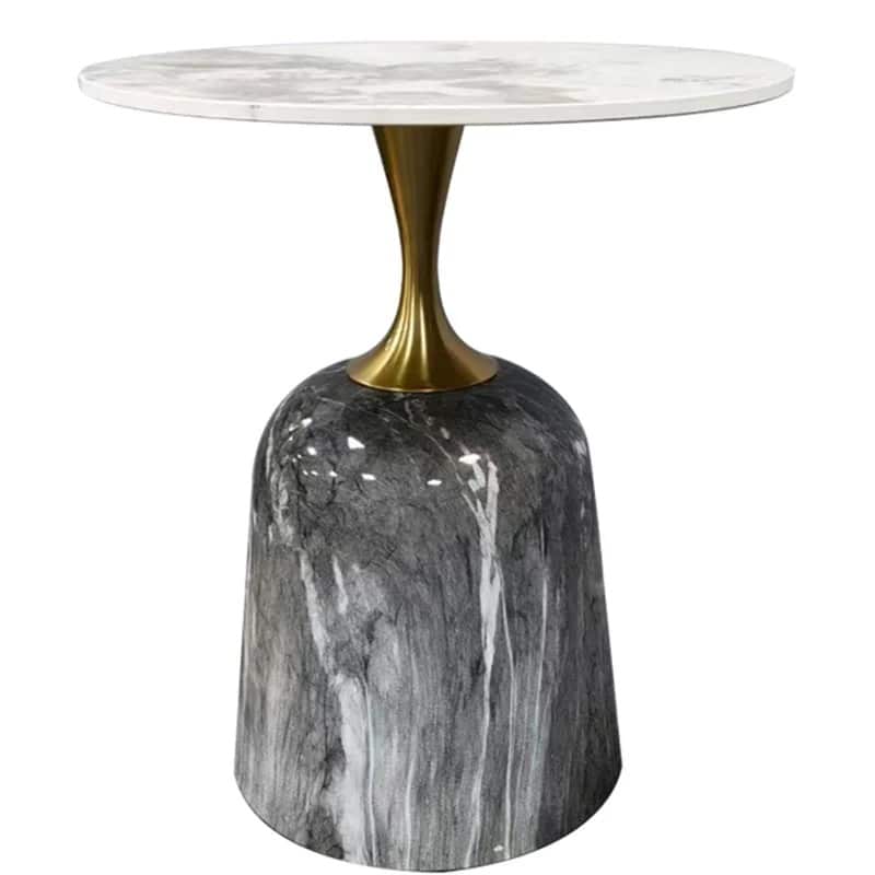 Carol Line kerek lerakóasztal, dohányzóasztal  agromerált fehér márványlappal & arany színű rozsdamentes láb & kerámia talpazat.