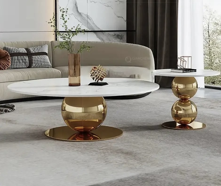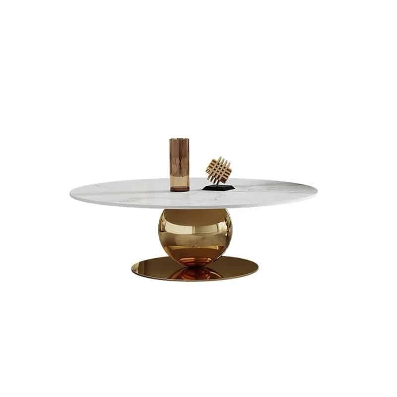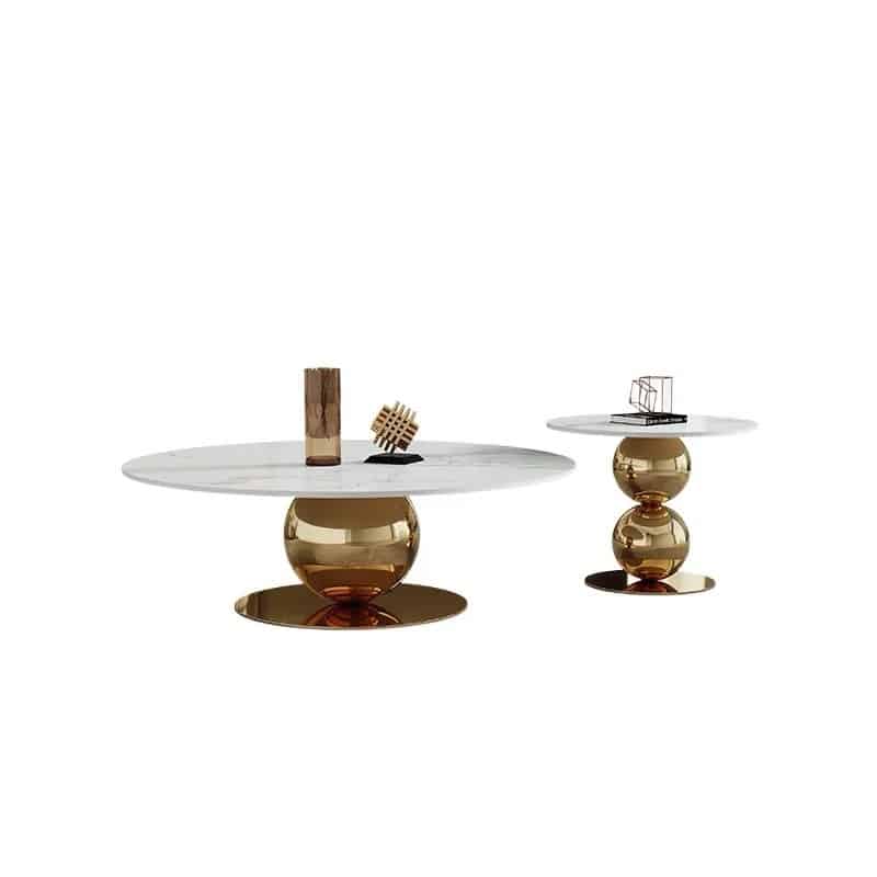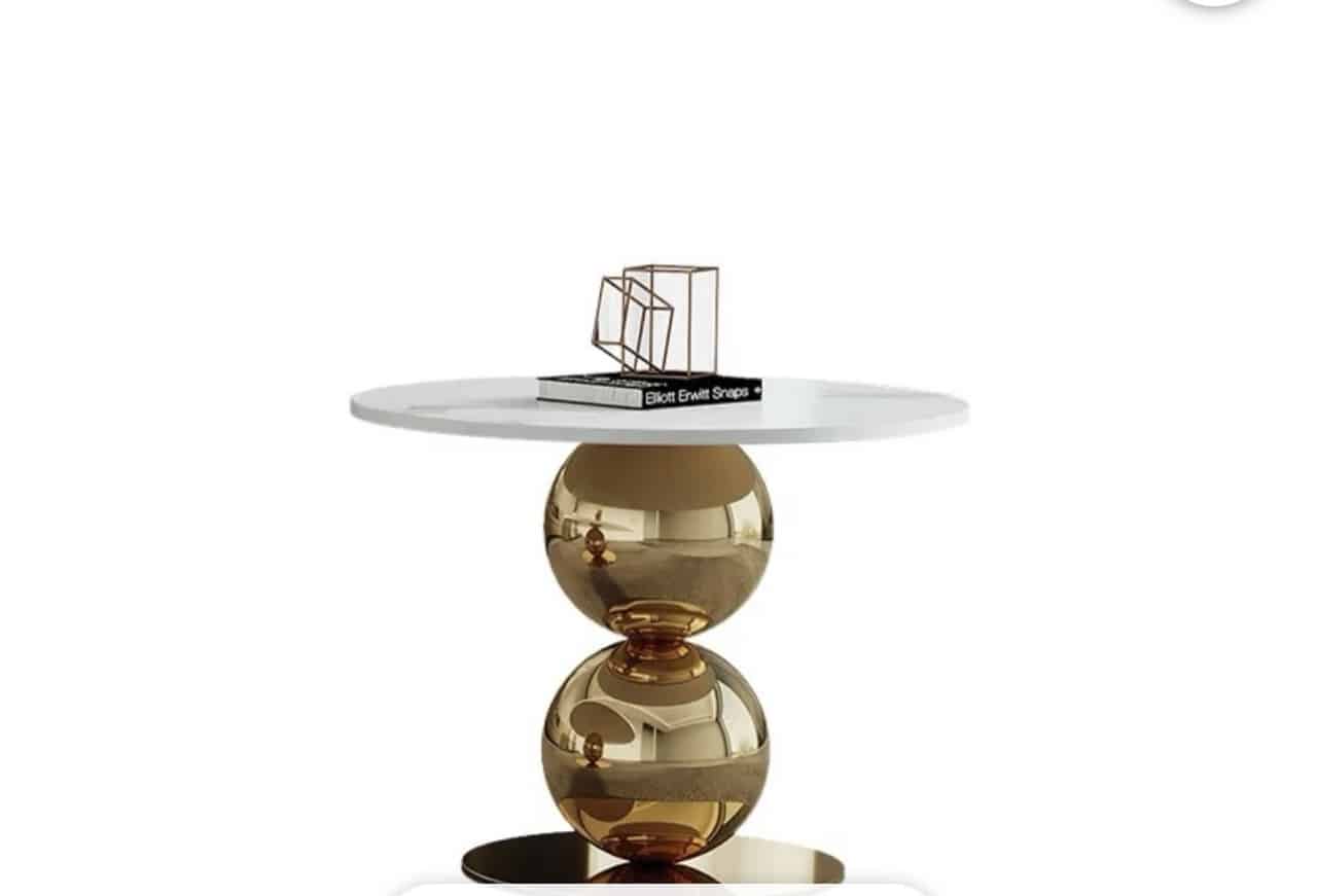 Kerek small lerakóasztal, dohányzóasztal  agromerált fehér márványlappal & arany színű rozsdamentes gömb láb.