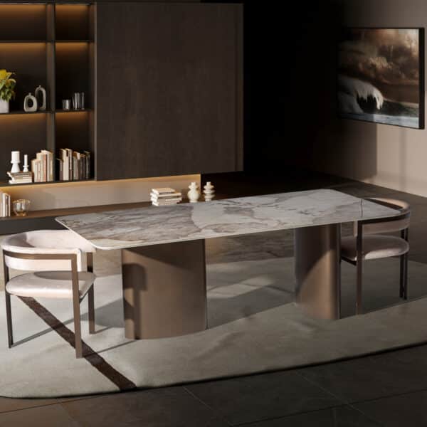 Kezdőlap Webshop Bútorok Asztal, konzol, lerakó Tokyo étkezőasztal Fém láb – Bézs kő hatású Porcelán asztallappal 215 cm