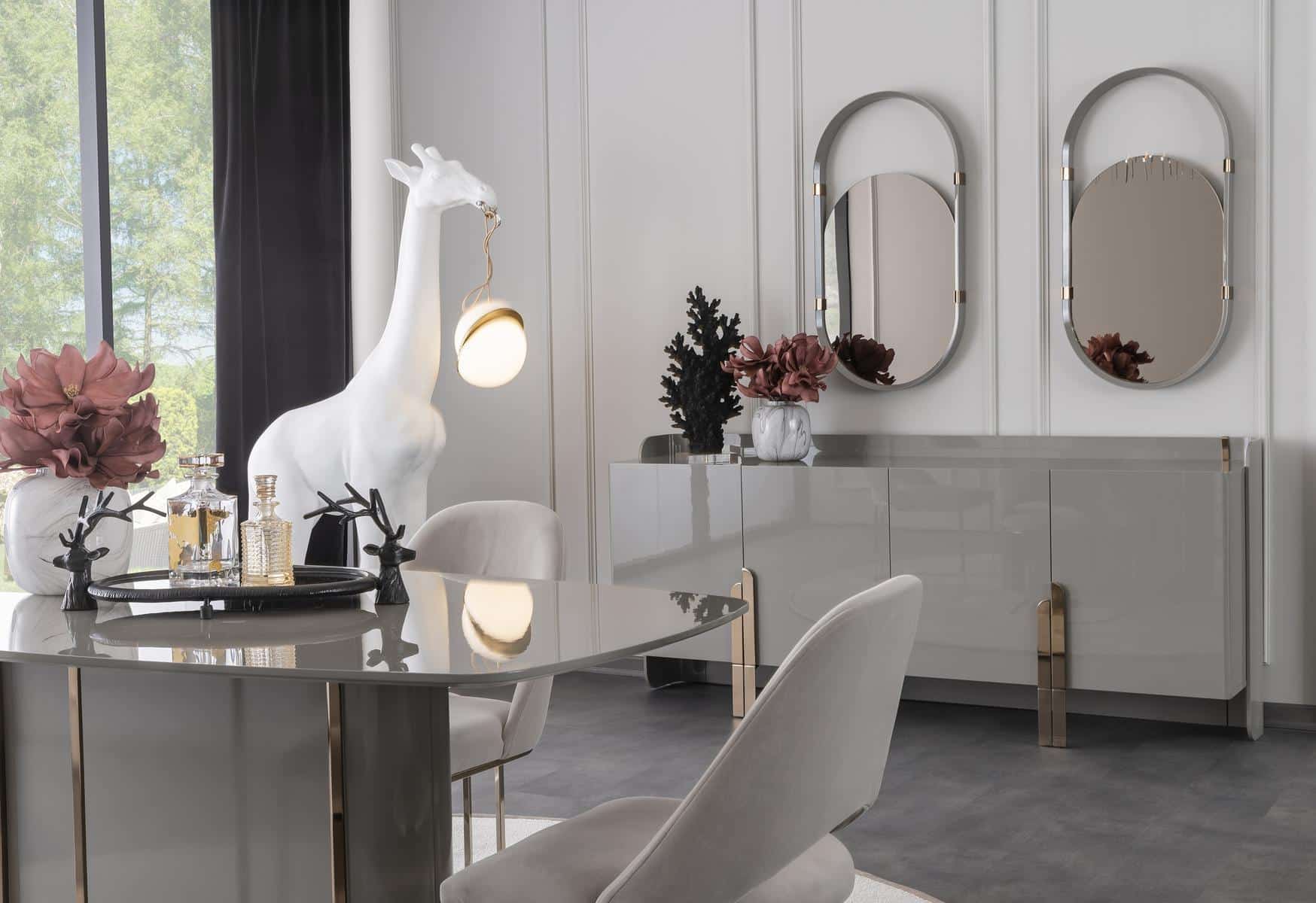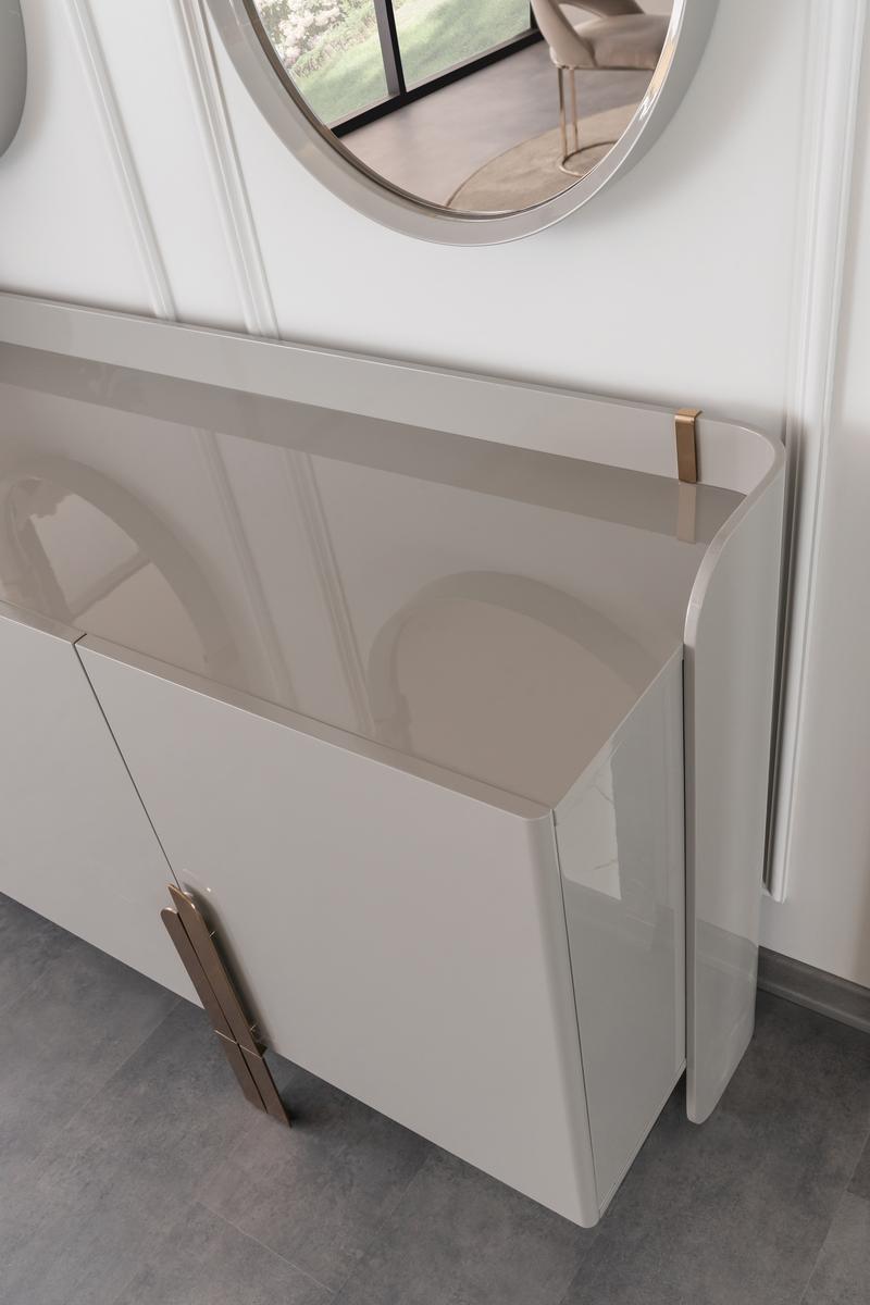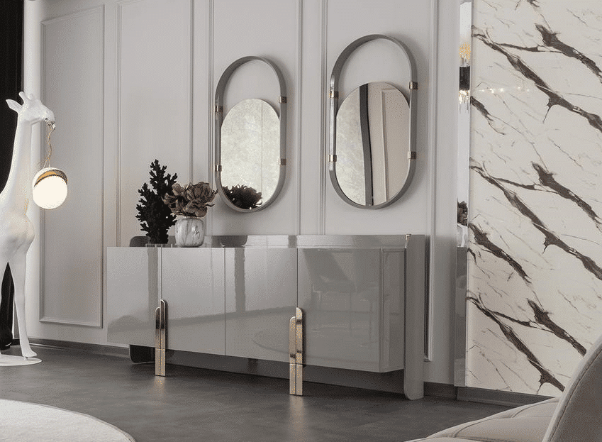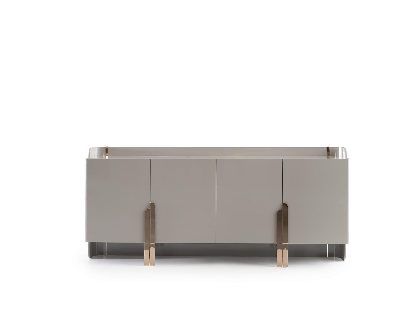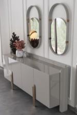 Beyonce komód/tálalószekrény magasfényű szürke felületellen és bronz lábakkal. A tükrök a komód/tálalószekrény tartozékai.