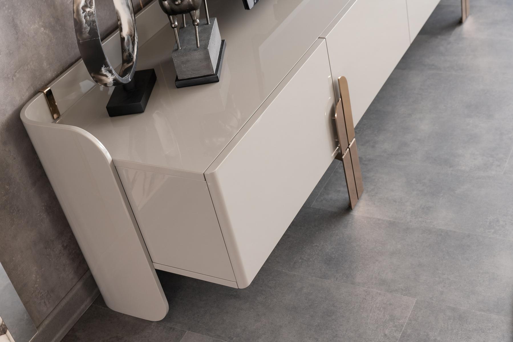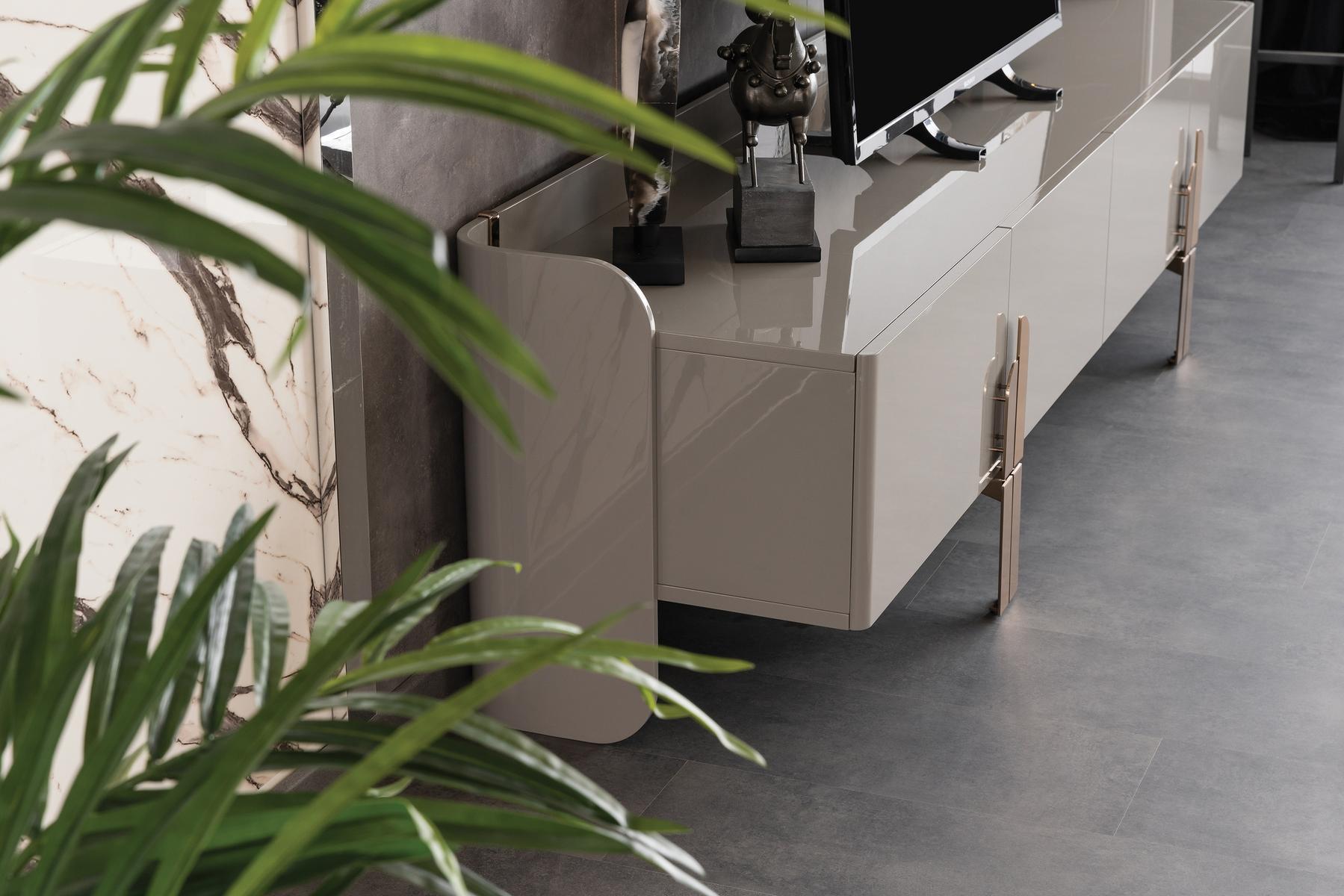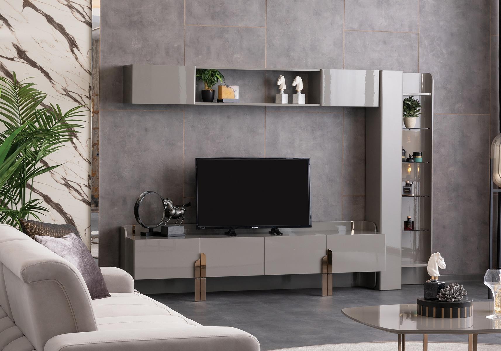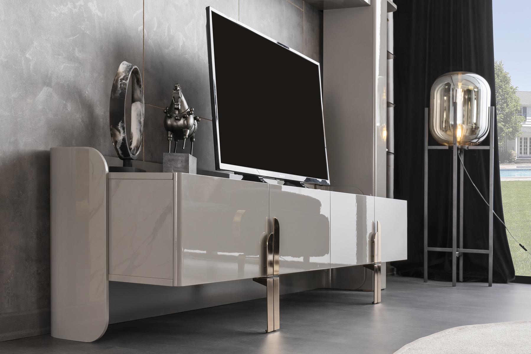 Beyonce Tv szekrény magasfényű szürke felülettel és bronz lábakkal.