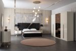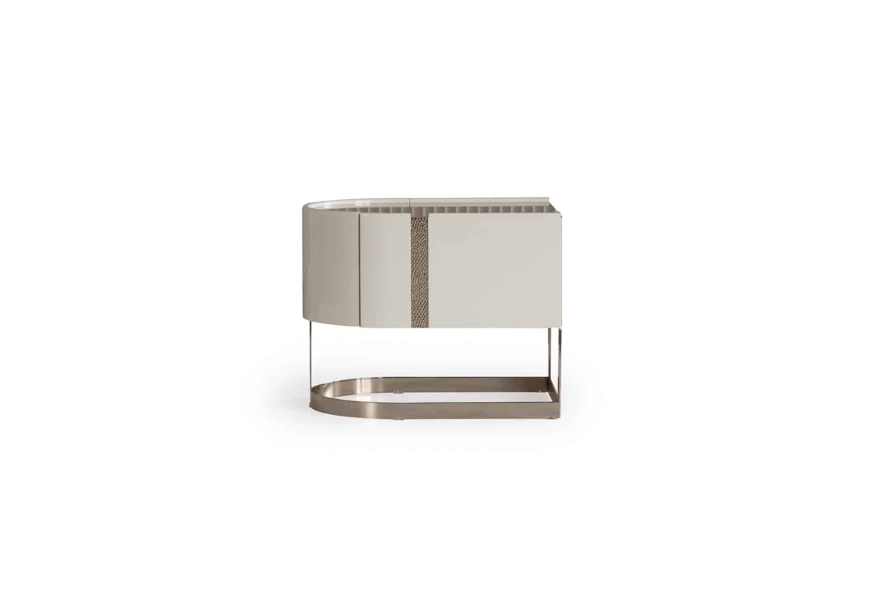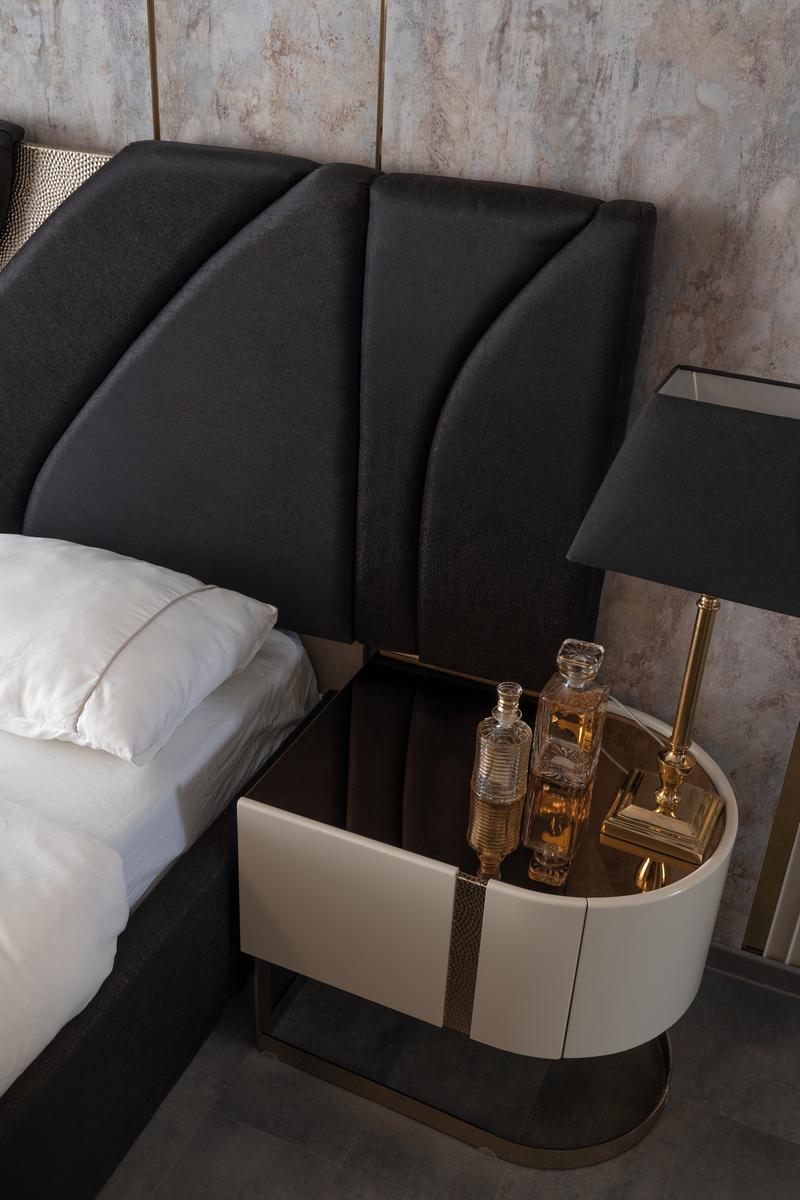 Aura éjjeliszekrény krém színben bronz lábakkal és díszítéssel. Az éjjeliszekrények attól függően, hogy jobb vagy bal oldalra kerülnek, eltérő kialakításúak.