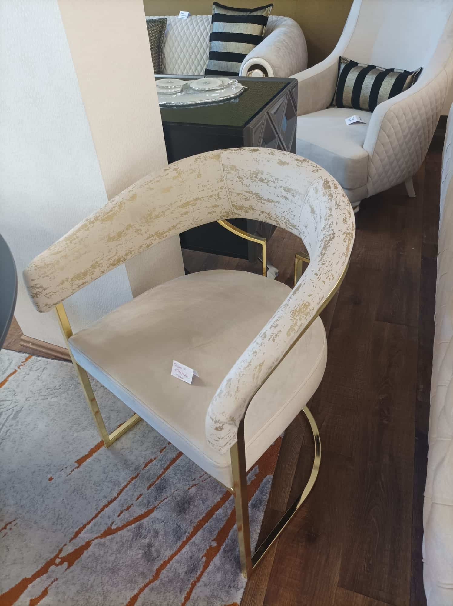 Készleten: bézs bársony ülőfelülete, arany-és bézs mintás bársony háttámla, arany lábszerkezet (az utolsó 3 képen látható a tényleges színe)