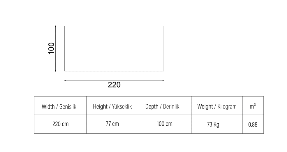 Méret : 220 cm hosszú, 100 cm széles, 76 cm mély