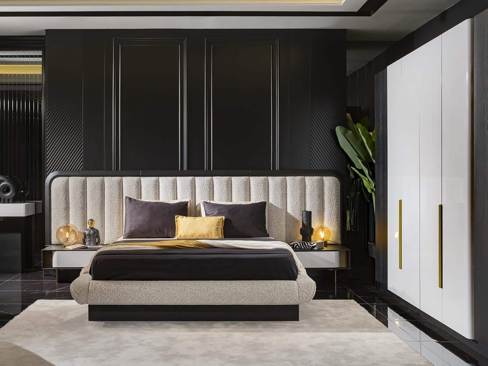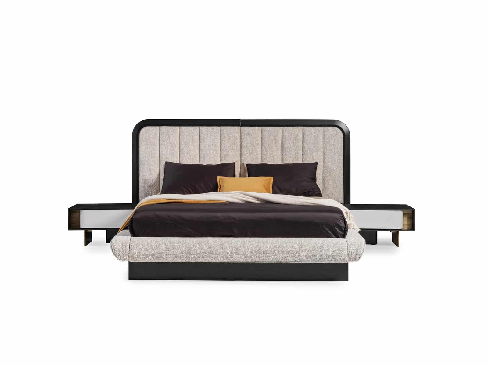 Kezdőlap Webshop Bútorok Fotel, kanapé, franciaágy Ágy Etro franciaágy matrac nélkül, bézs szövettel, fekete fa kerettel