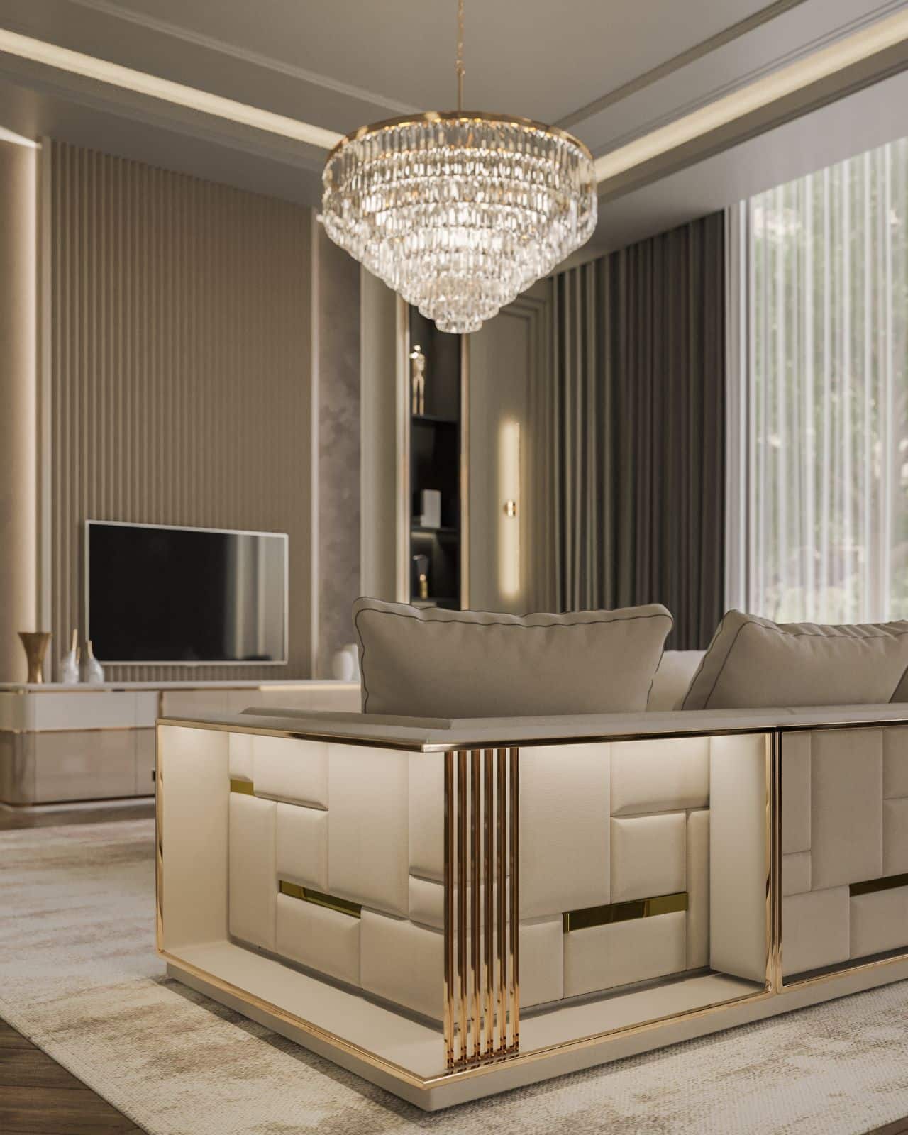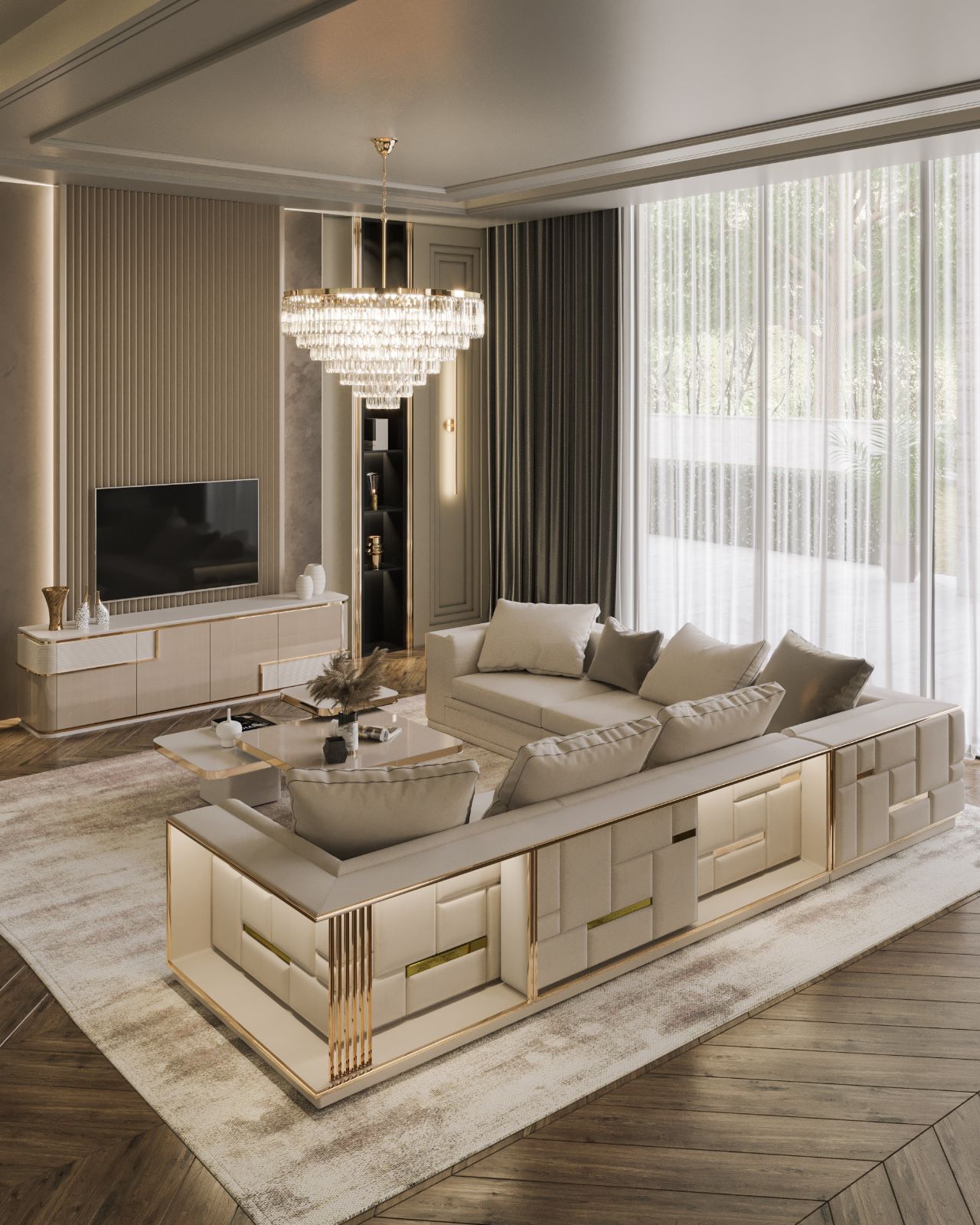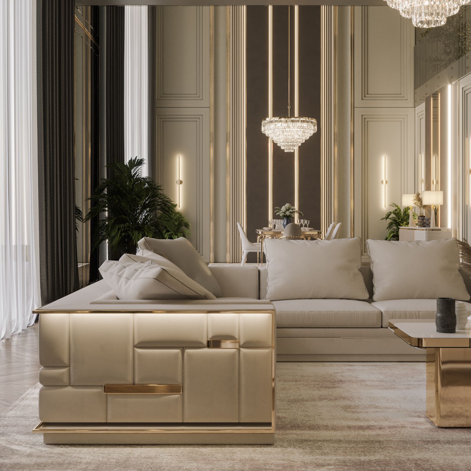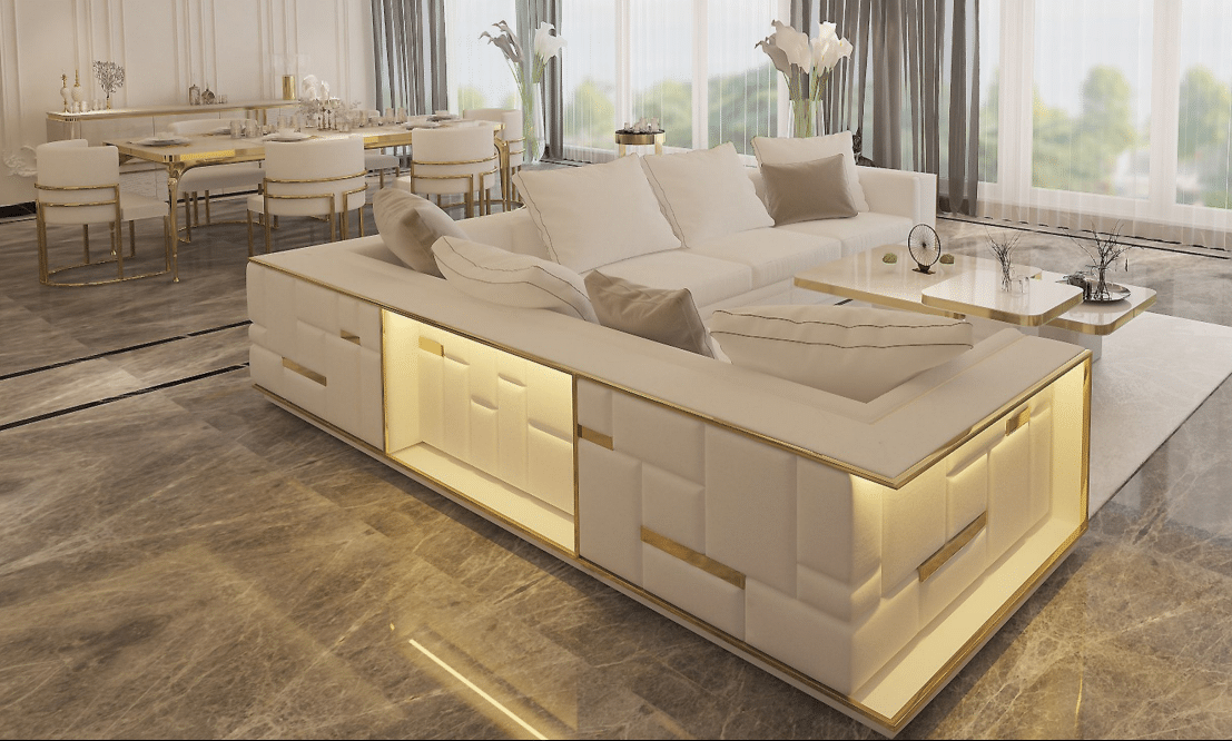 Firenze “L” alakú kanapé krém színű textillel és arany díszítéssel. A kanapé hátoldalát különleges hangulatfények világítják meg.
