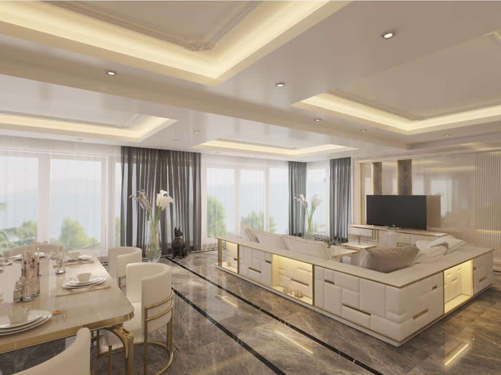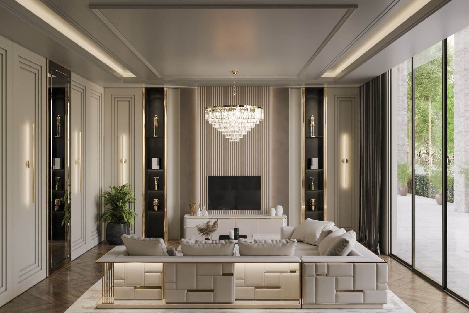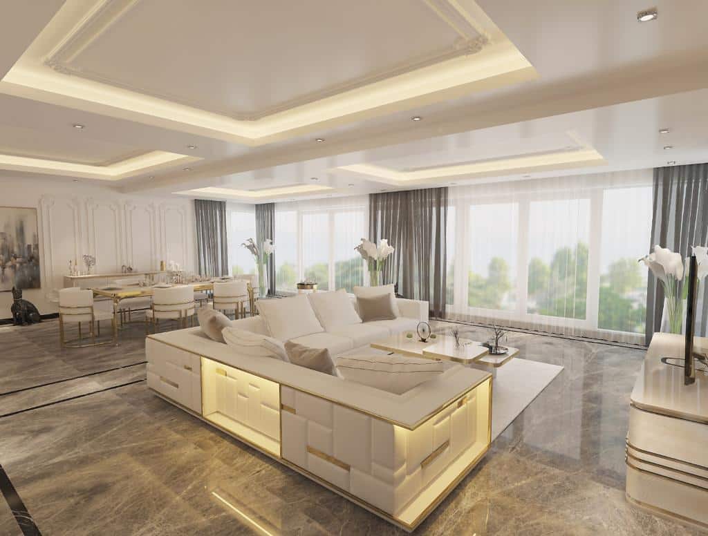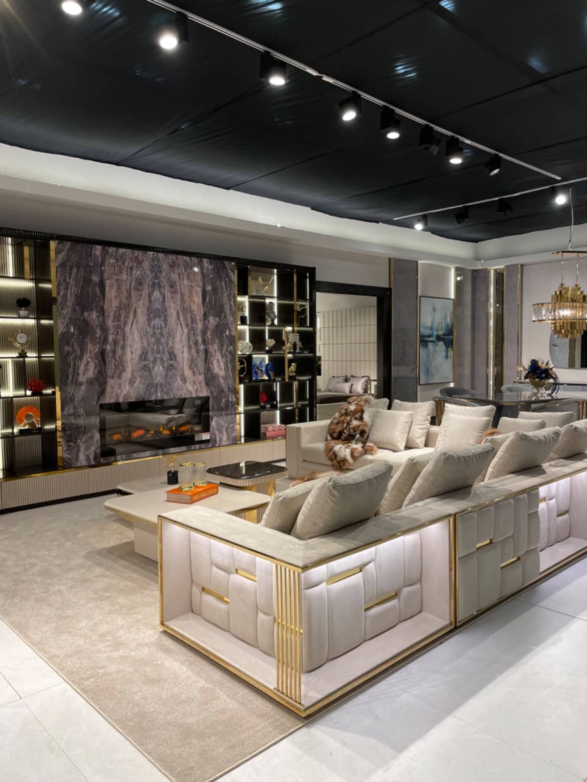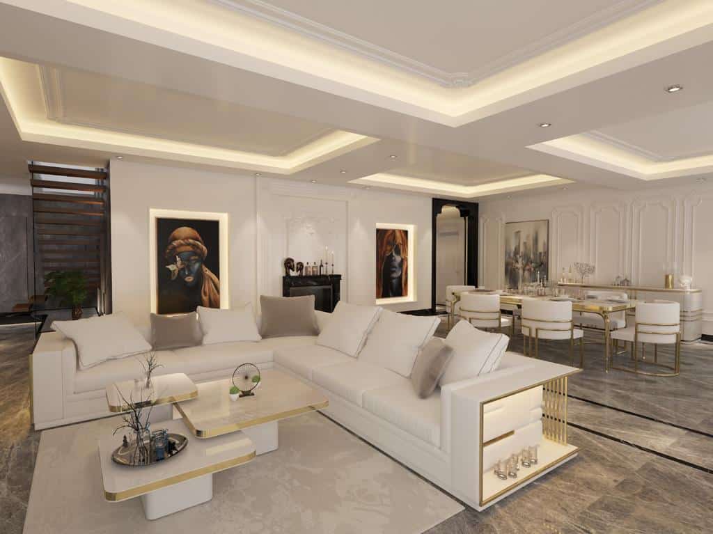Firenze “L” alakú kanapé krém színű textillel és arany díszítéssel. A kanapé hátoldalát különleges hangulatfények világítják meg.
