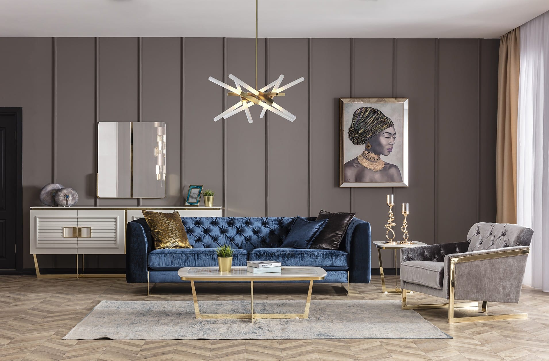 Glória kanapé / szófa négy személyes bársony anyag,  arany lábakkal.
