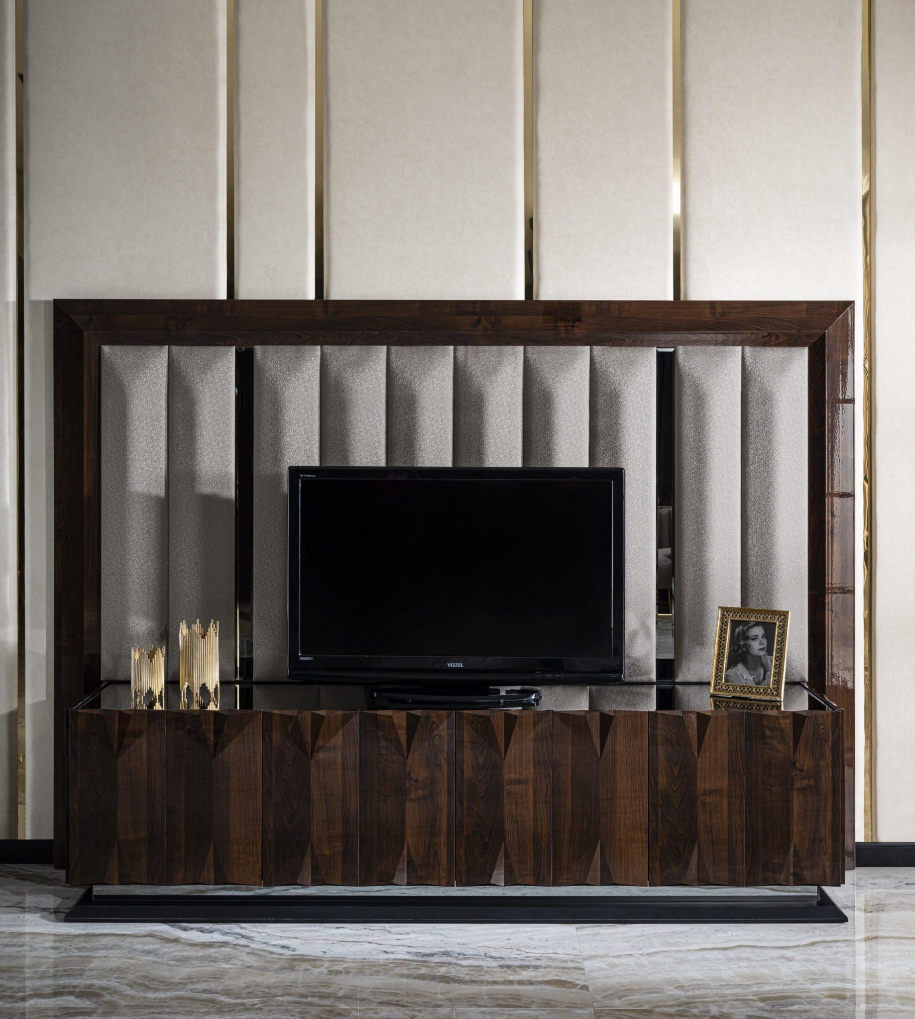 Prada Tv szekrény – magasfényű barna & arany. Választható opció a hátfal.