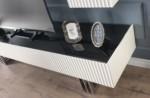 Matt fehér szekrény króm lábakkal, fiókkal. Méret: hosszúság: 212 cm, szélesség: 48 cm, magasság 51 cm.