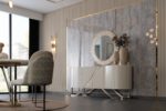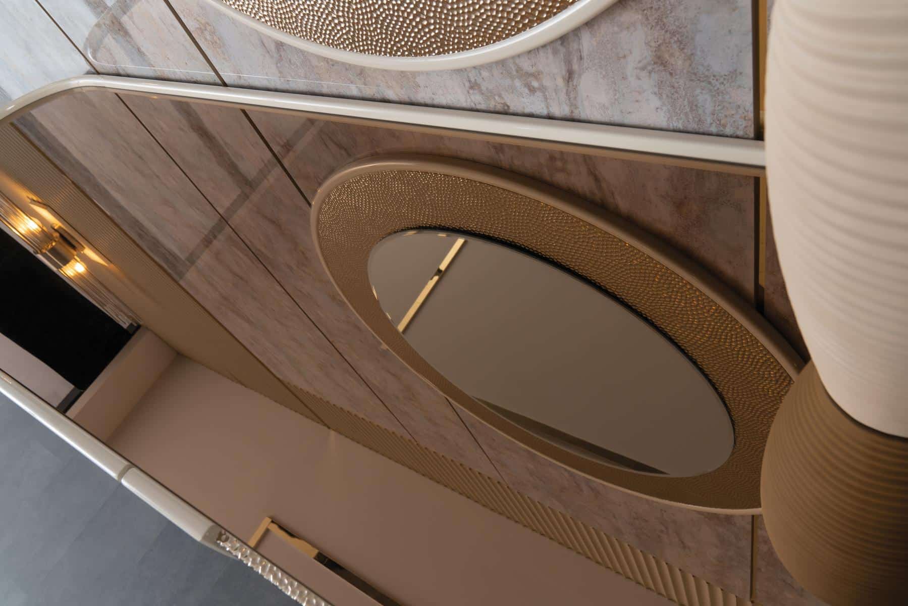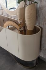 Aura komód / tálalószekrény kerek tükörrel, krém színben, bronz lábbal és díszítéssel.