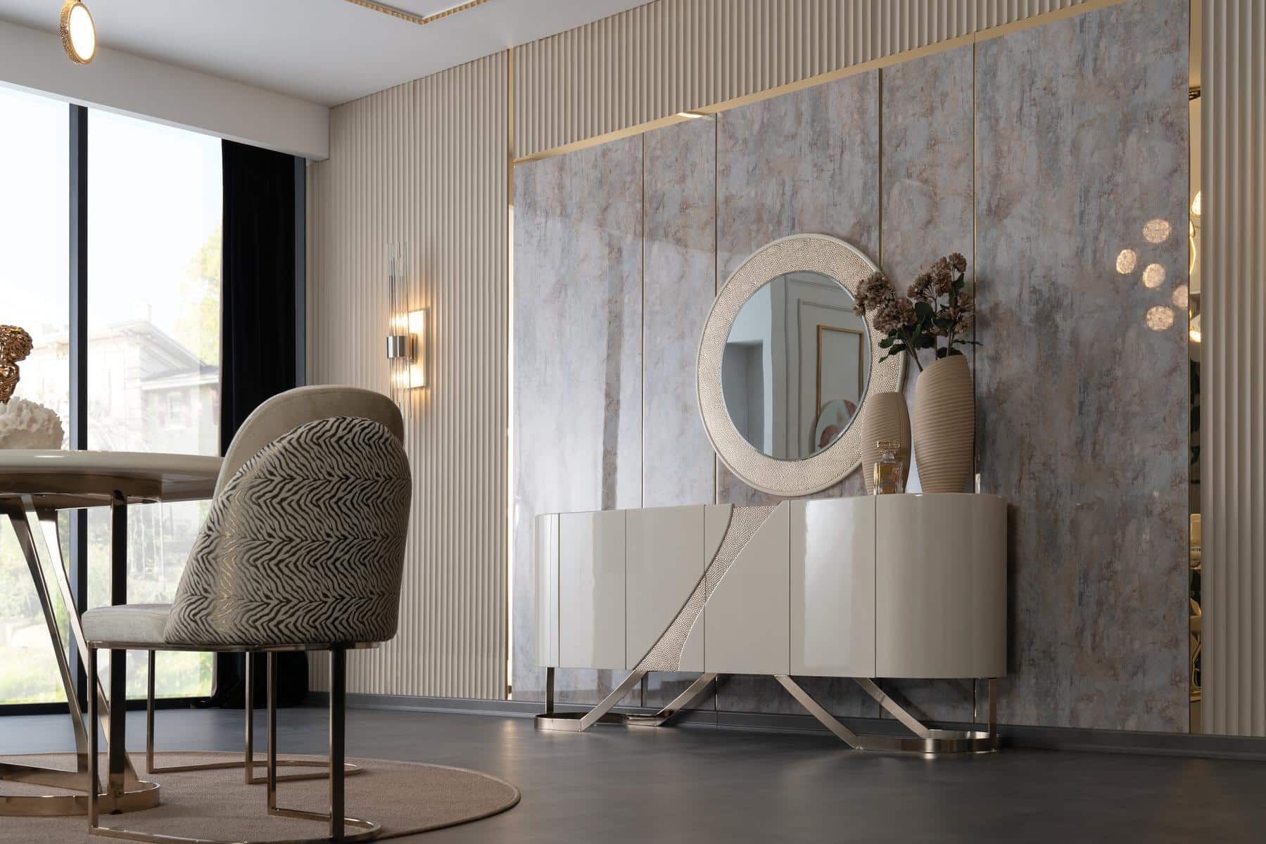 Aura komód / tálalószekrény + kerek tükör – krém & bronz