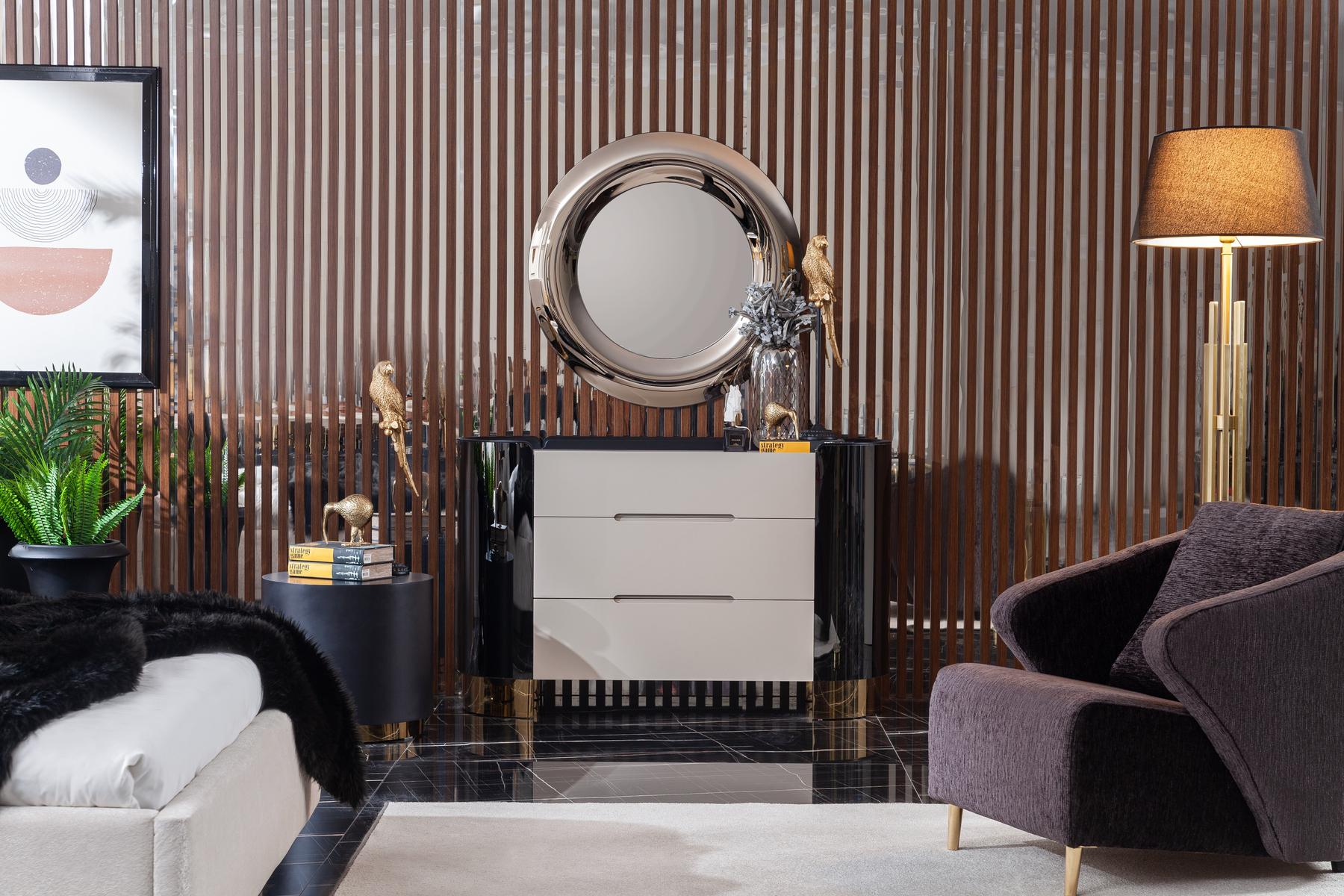 Kezdőlap Webshop Bútorok Szekrény, komód Komód Octo fésülködő szekrény/komód – krém & arany & fekete – BEVEZETŐ ÁR