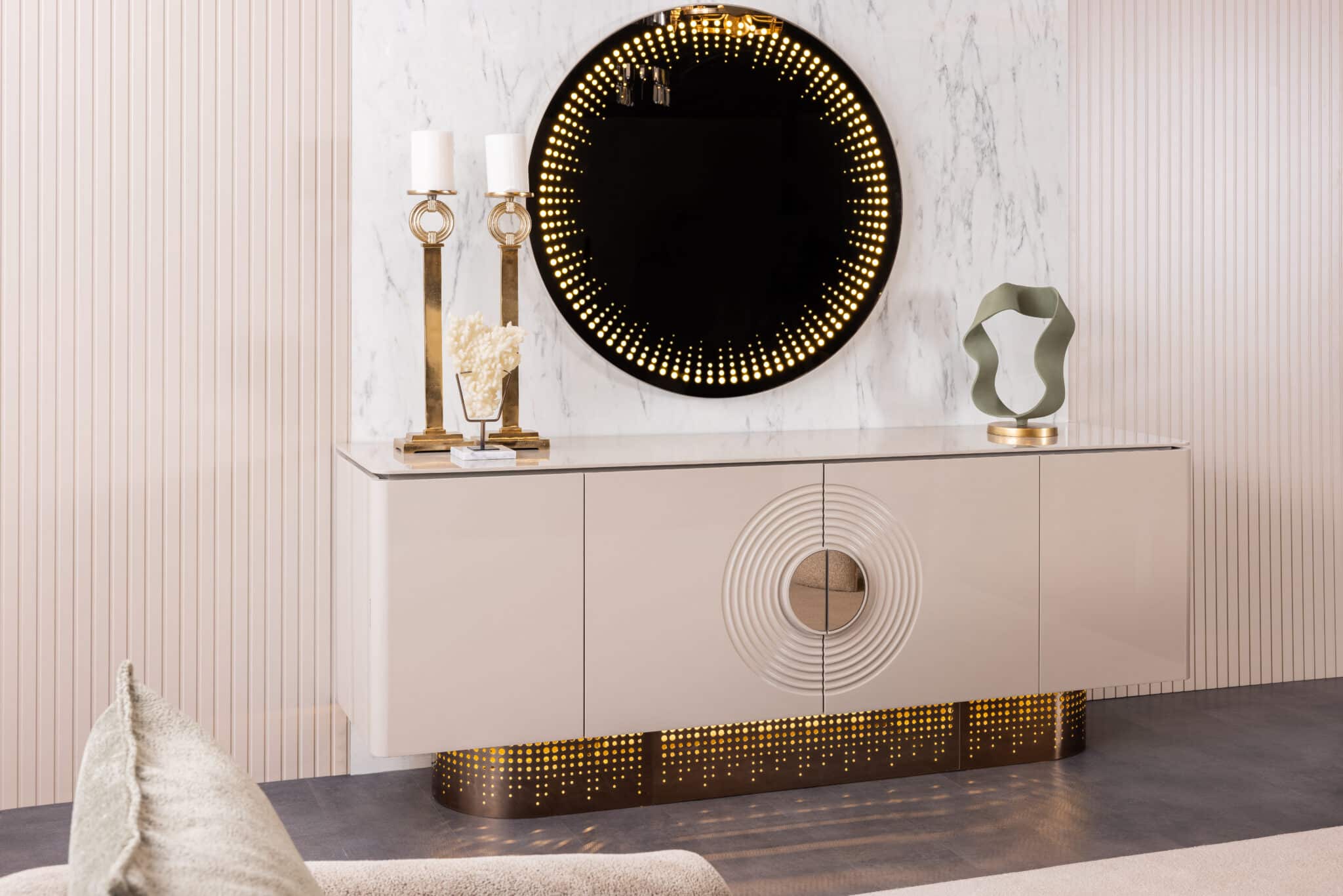 Kezdőlap Webshop Bútorok Szekrény, komód Komód Panamera tálalószekrény, bézs & arany beépített LED világítással