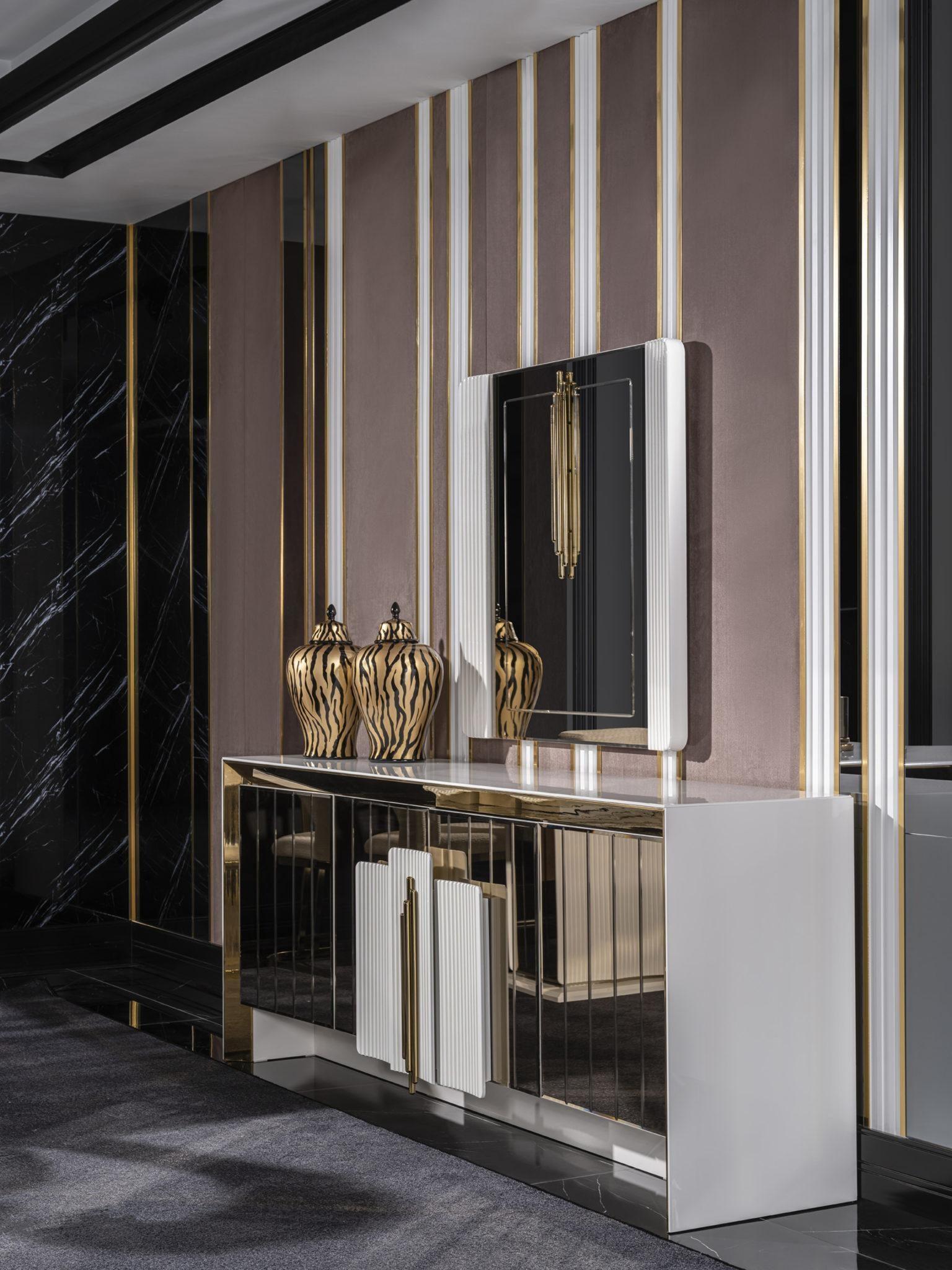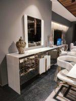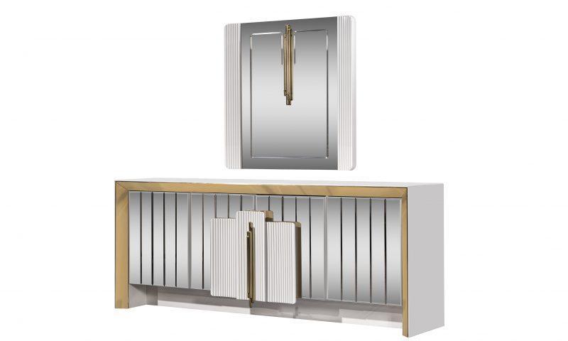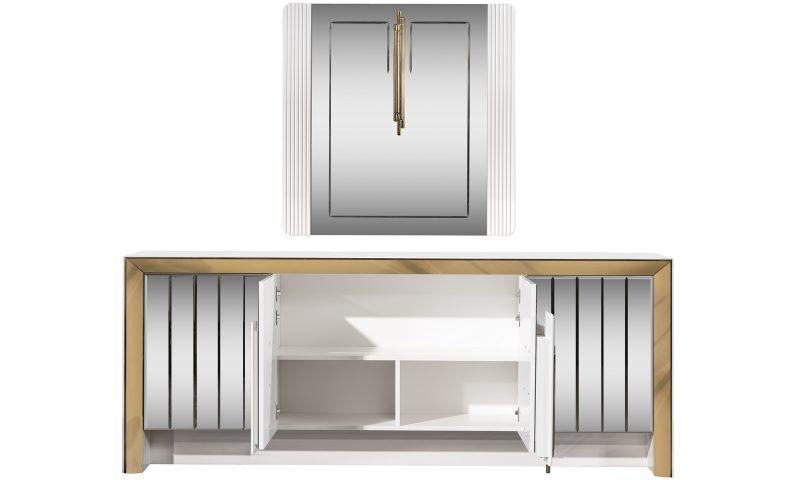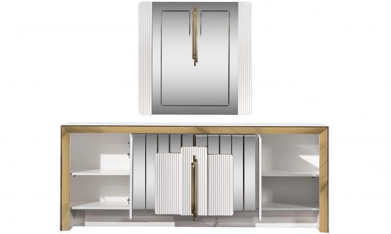 Vegas tálalószekrény magasfényű fehér a felülete &  arany és tükör lap dekorációval.