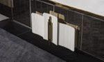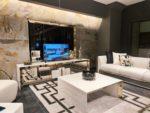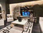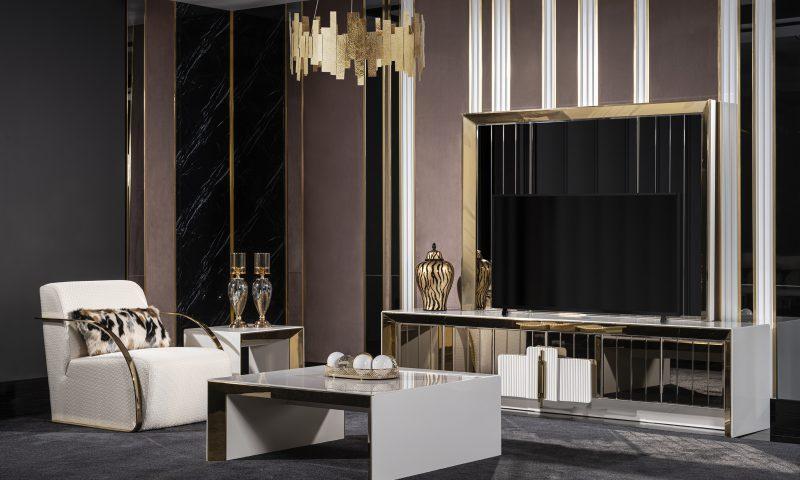 Vegas tv szekrény magasfényű fehér a felülete &  arany és tükör lap dekorációval.