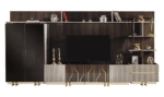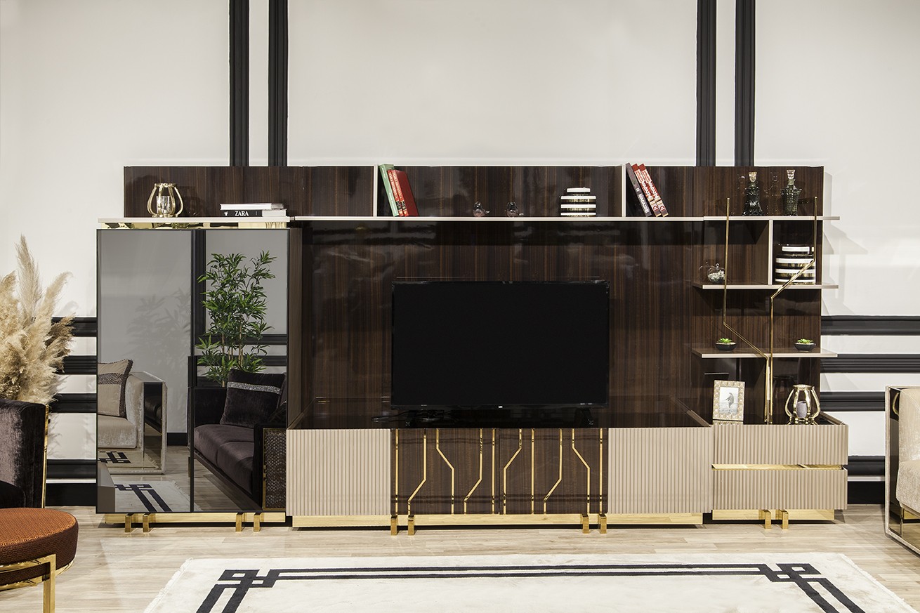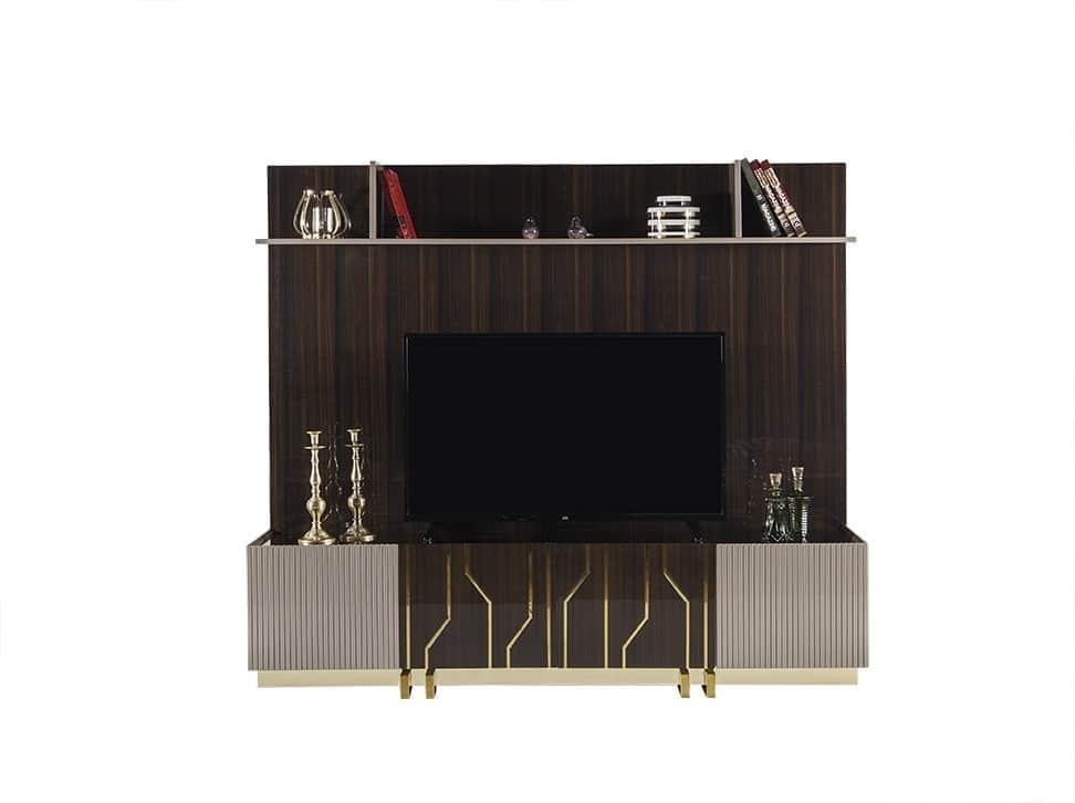 Kezdőlap Webshop Bútorok TV szekrény Vitra Tv szekrény falpanellel – barna & arany