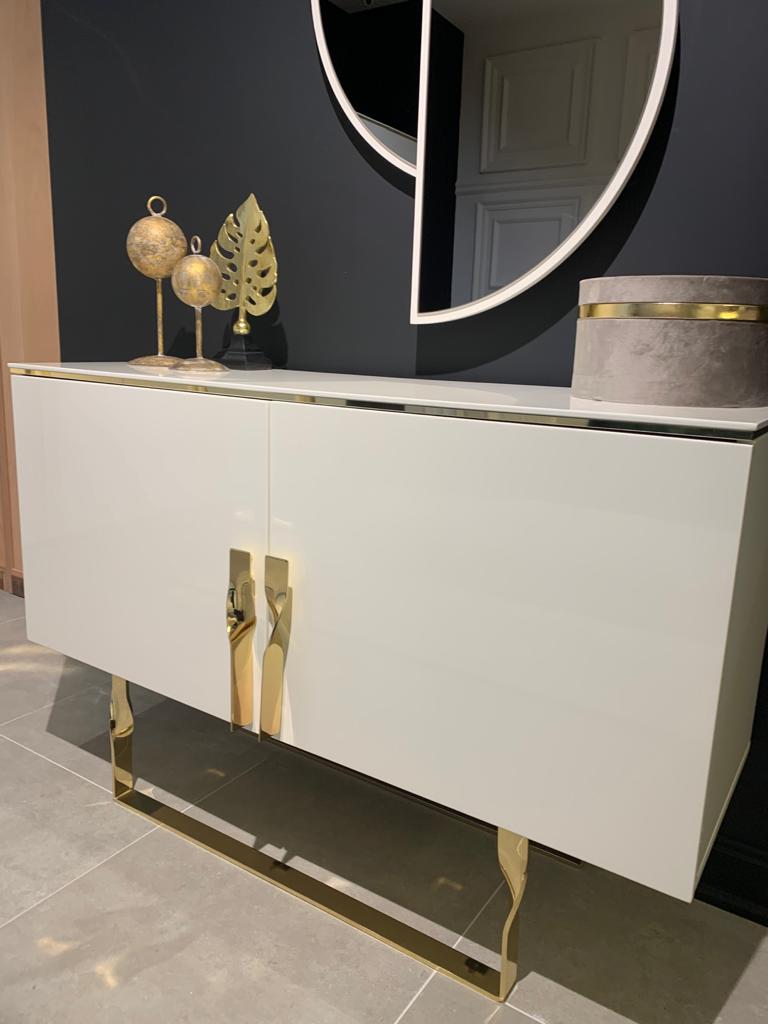 Zen magasfényű fehér fésülködő asztal vagy konzolasztal arany lábakkal.