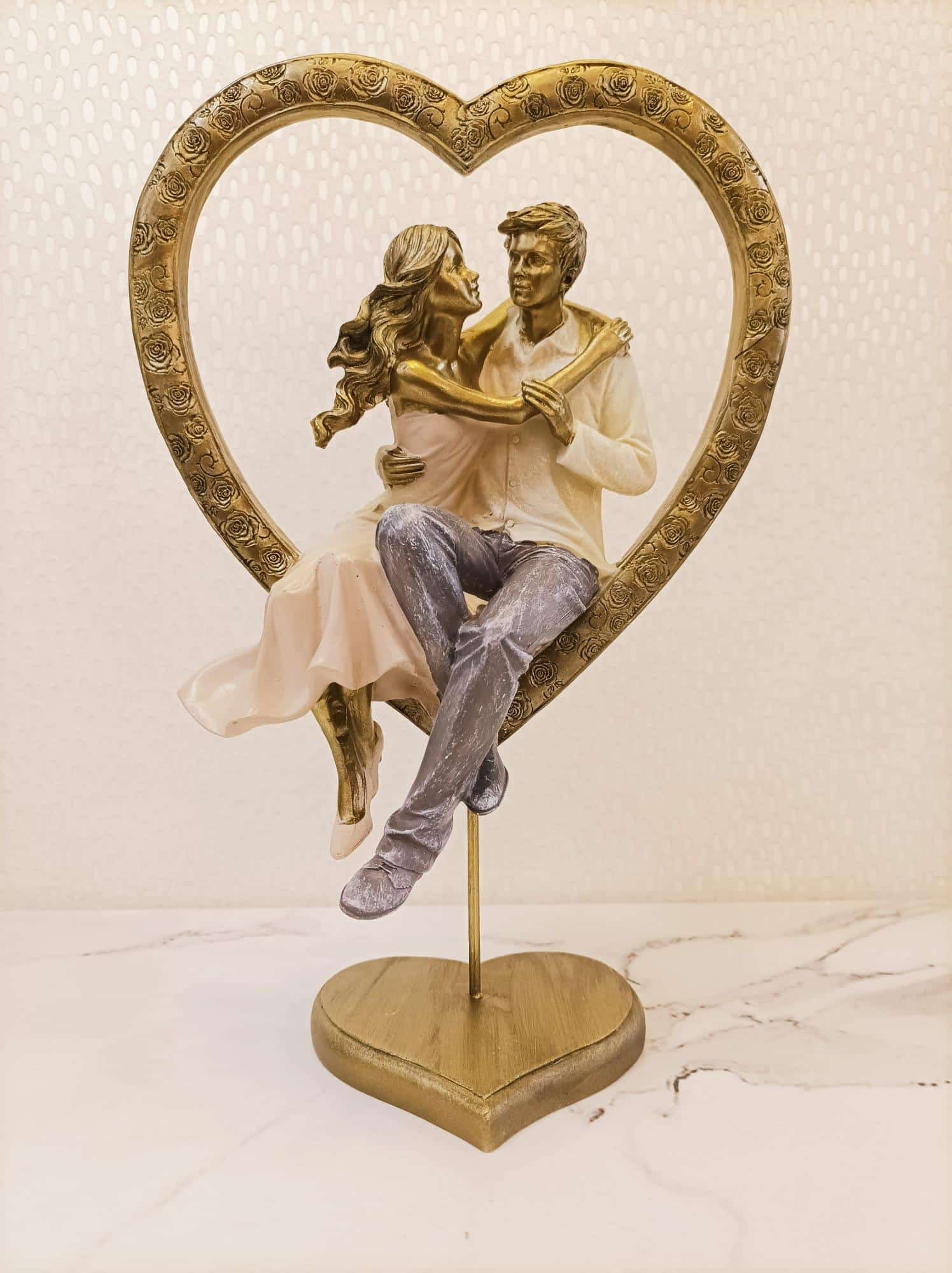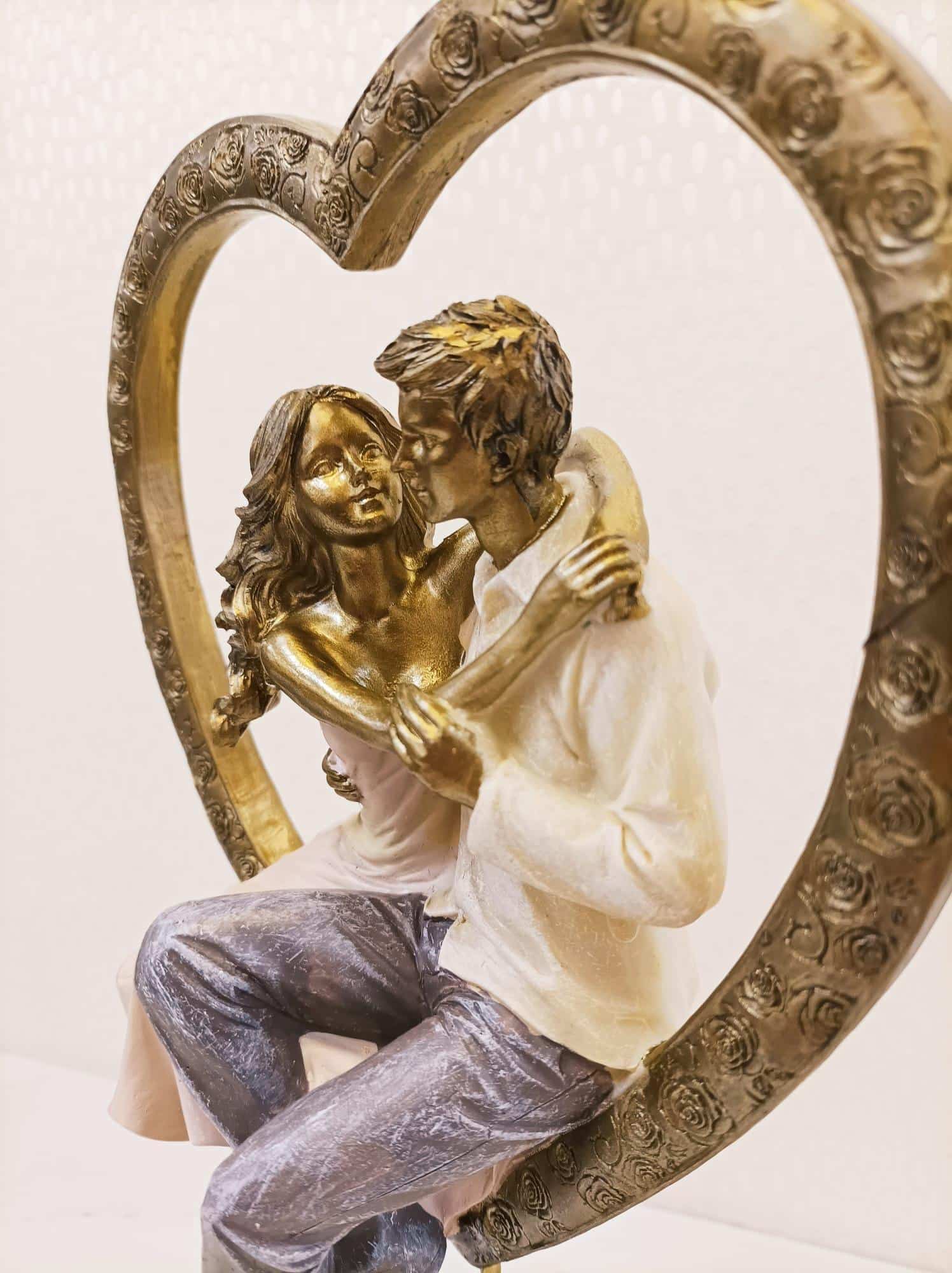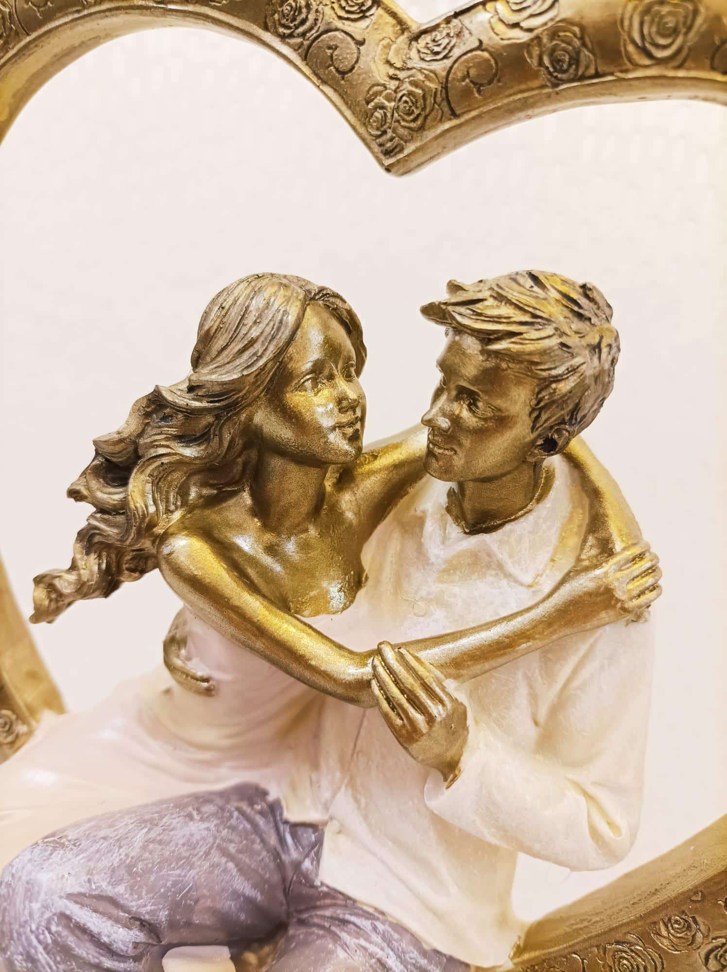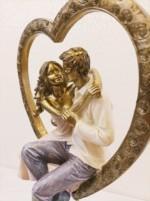 Egy szív alakú keretben ülő, egymást ölelő szerelmespár figurája rózsaszín, fehér, szürke és arany színben.
