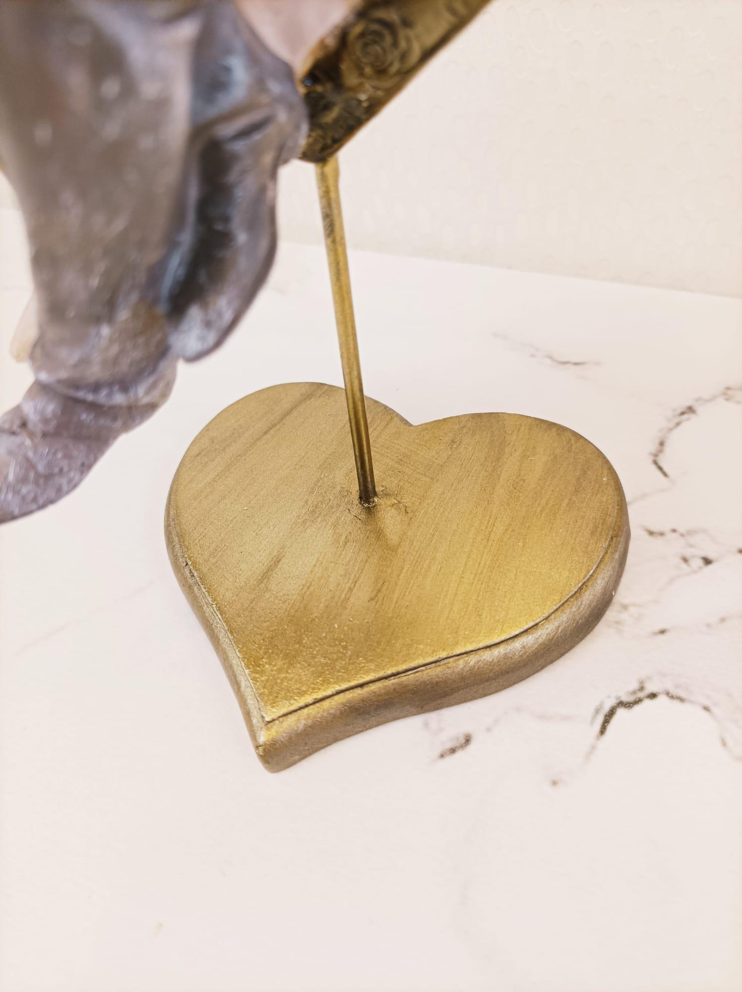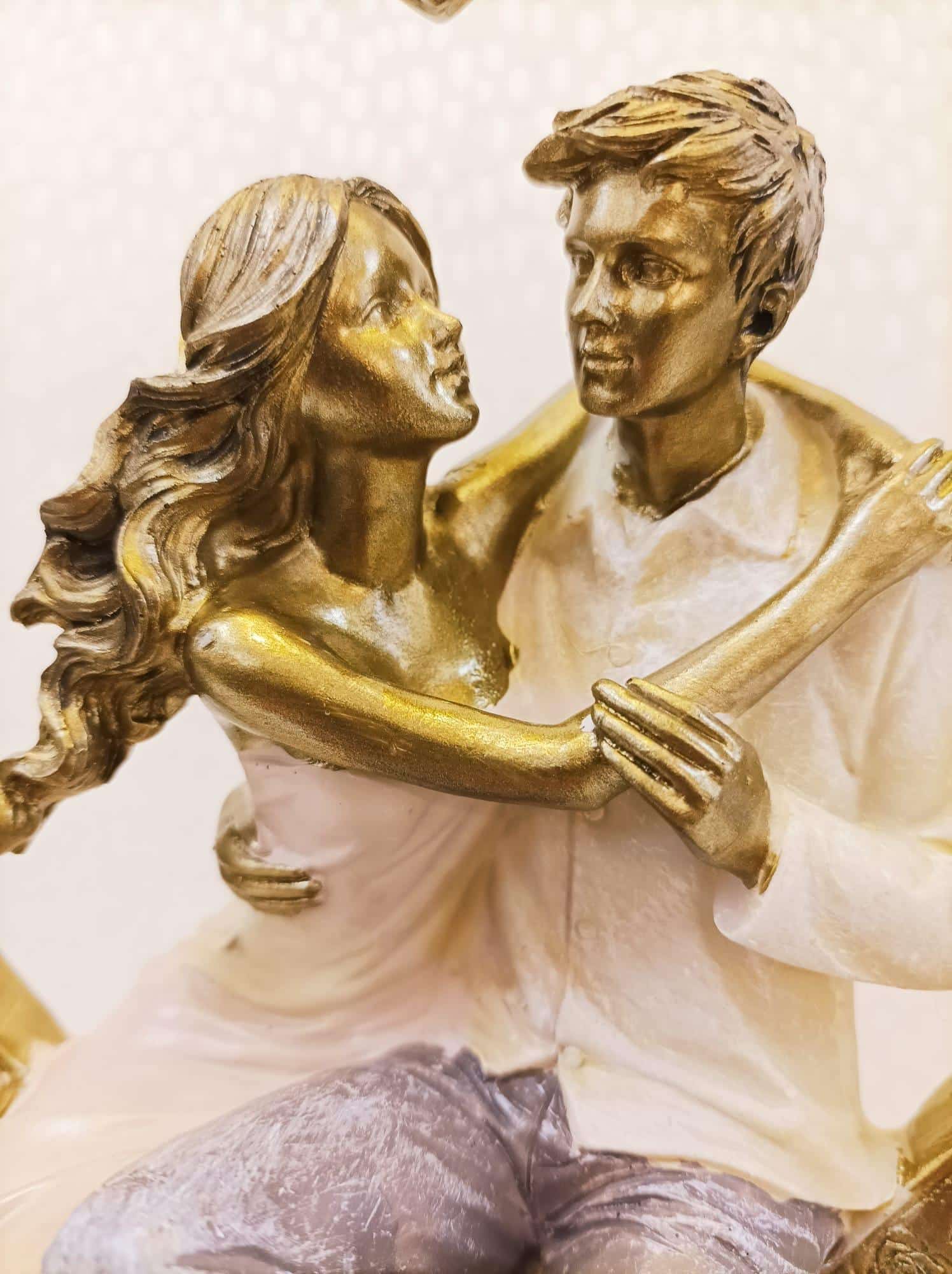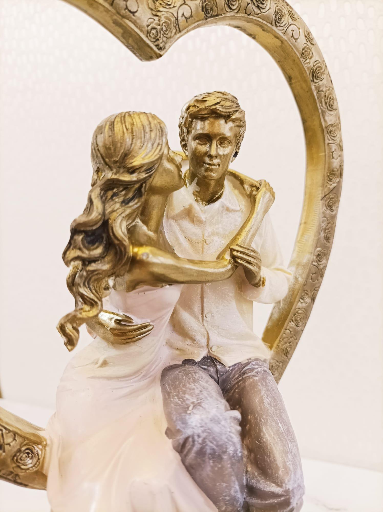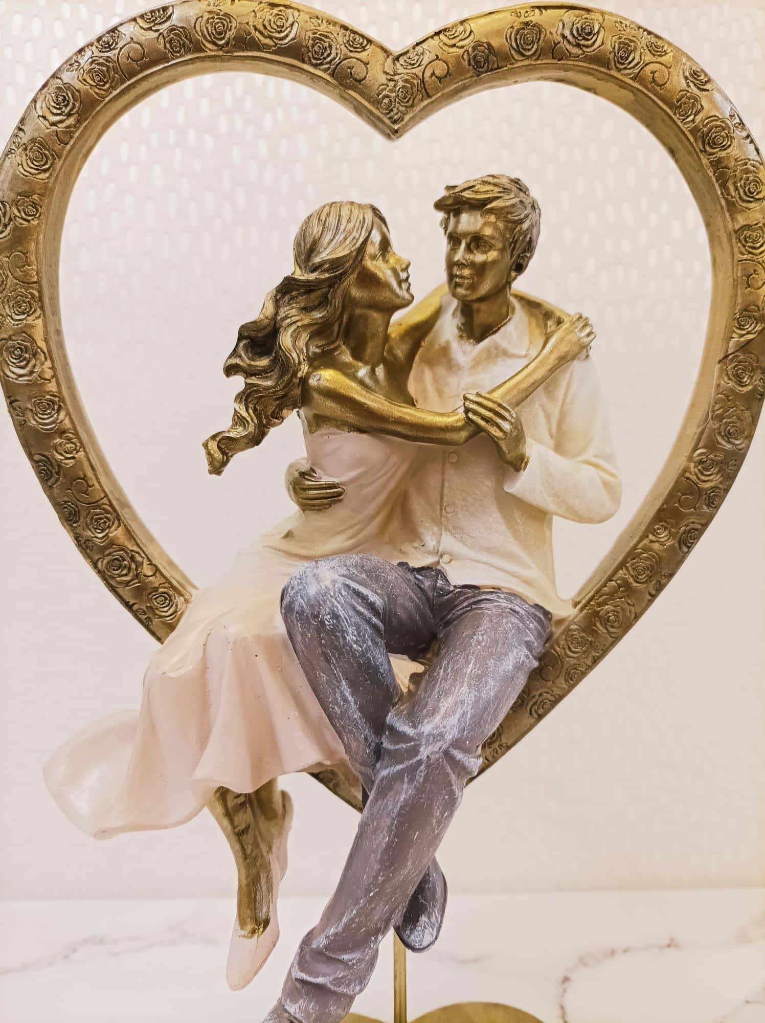 Egy szív alakú keretben ülő, egymást ölelő szerelmespár figurája rózsaszín, fehér, szürke és arany színben.