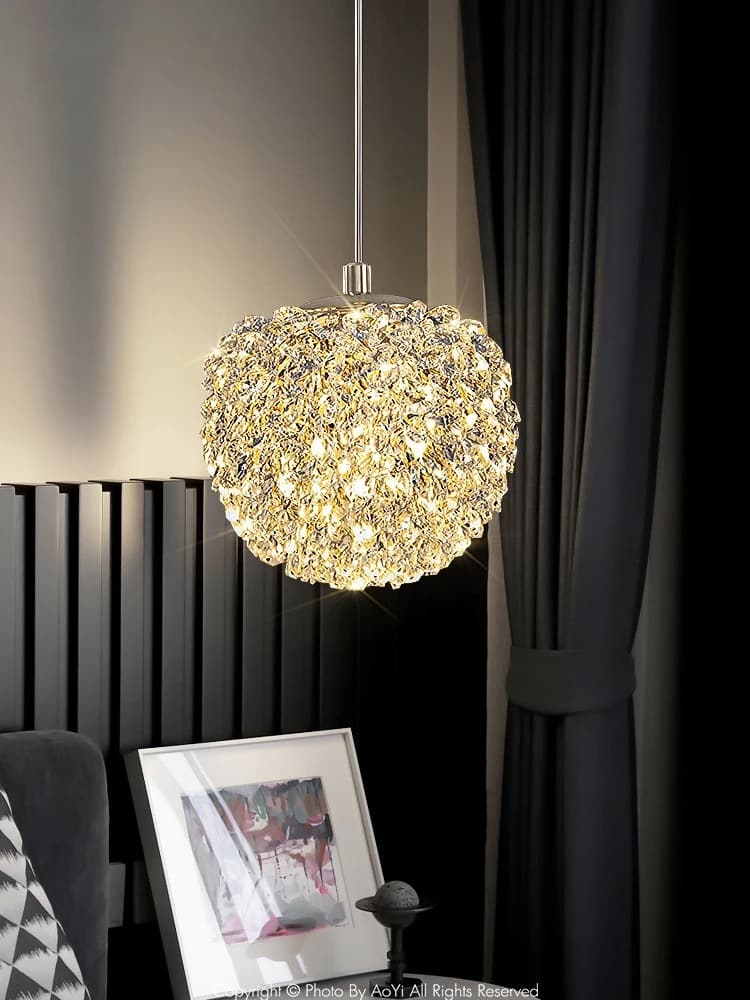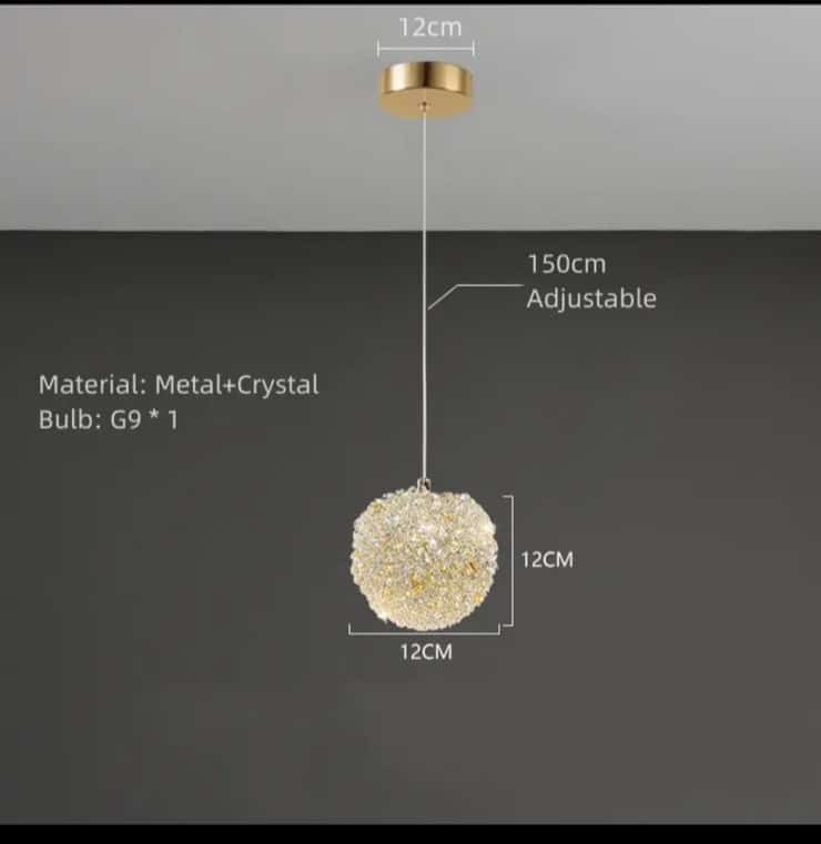 Függőlámpa, acél test+k9 kristály, 1 x 12 cm-es gömb, max. 2 m hosszú függeszték,