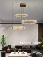 Bo Mercedes függesztett lámpa, arany és kristály, 3 gyűrűs, 20, 60 és 40 cm